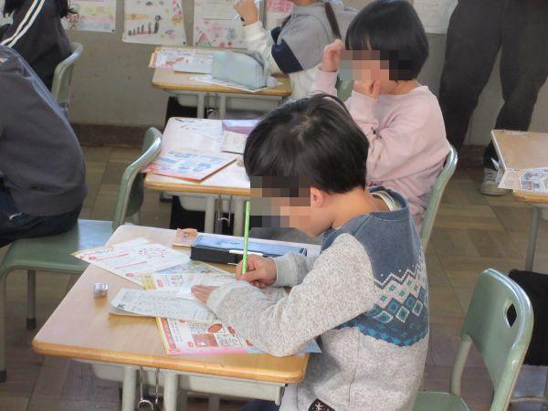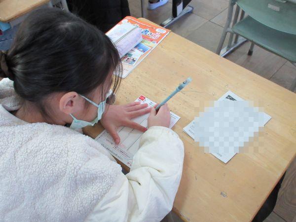 手紙が届くまでの動画を視聴した後、宛名の住所や名前を書く場所を順番に教えてもらいました。授業の後半は、実際に一人1枚の年賀状を書く活動です。お家の方に協力していただき準備した宛先を見ながら、一文字ずつ丁寧に書いていました。裏面にはどんなメッセージを書いたのかな?