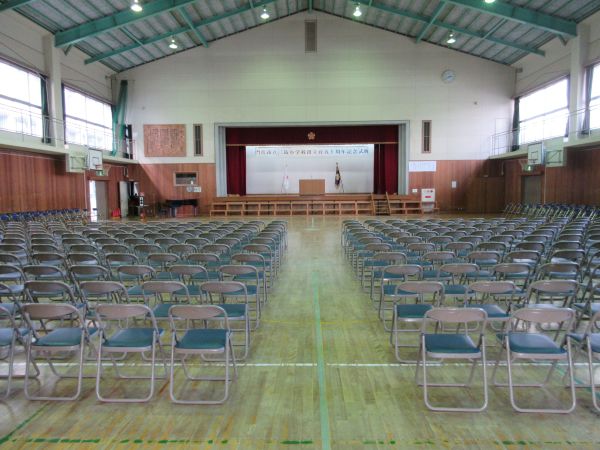いよいよ明日が創立150周年記念式典です。よく動く6年生が手伝ってくれて、体育館の準備が終わりました。この後は、PTAや地域の方が来てくださり、周年祭の用意が始まります。