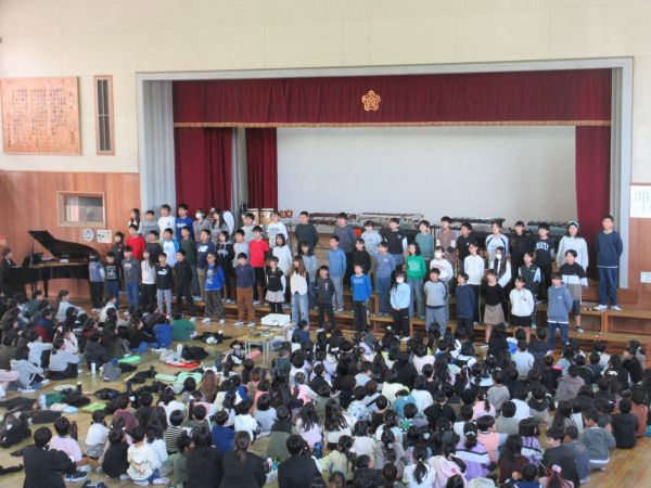 歌うのが大好きでとっても上手な二島小学校の子どもたち。校歌と全体合唱は見どころの一つです!