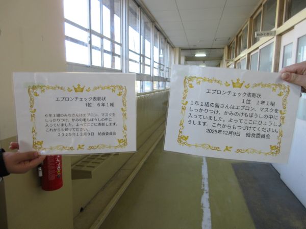 「エプロンチェック」と「給食全部食べ切ろう」の取組の結果発表