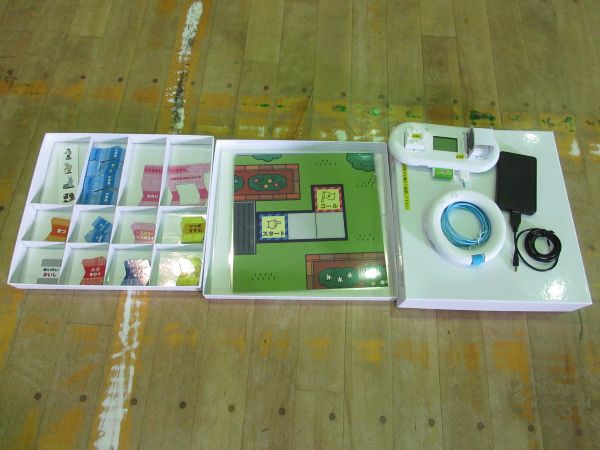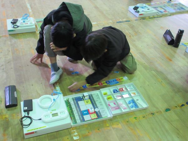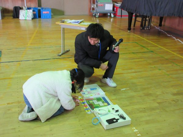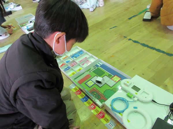 小さな車を指示通りに動かす練習を、いくつかのパターンの道が描かれた絵の上で行います。自分の頭の中でスタートからゴールまで進む車の動きをイメージして、一歩進む、右を向く、左を向く、くりかえしなどのカードを並べます。並べたカードの指示を車に読み込ませ、さあ発進!子どもたちの吸収力はすばらしいです。友だちと協力しながら次々と難しいミッションをこなしていき、笑顔を見せていました。プログラミングに興味をもった2時間になったことだと思います。