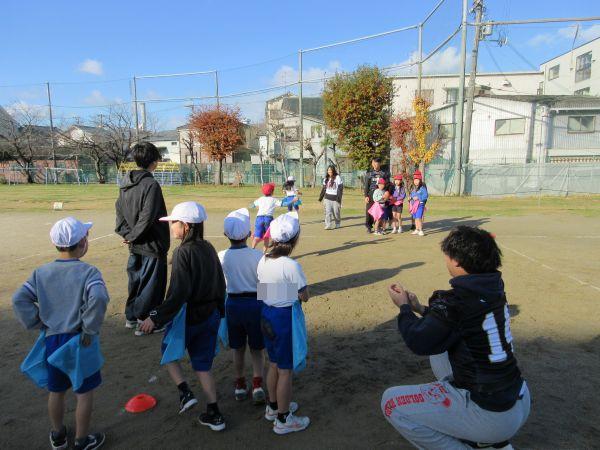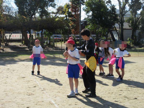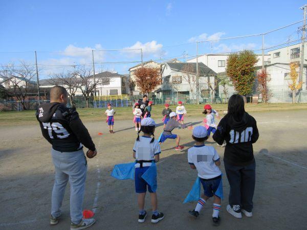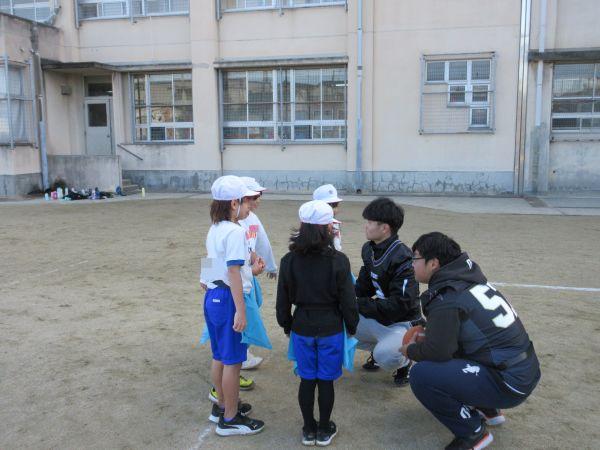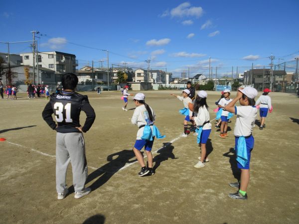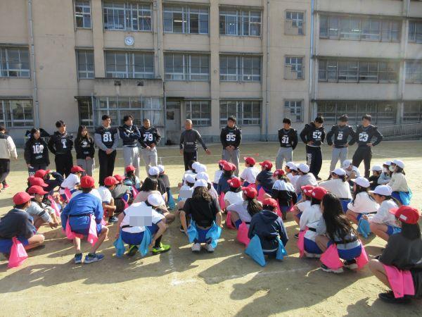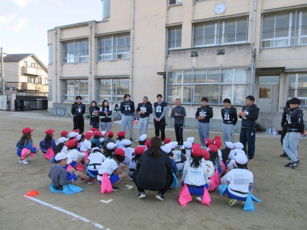 そんなフラッグフットボールを教えてくれる今日の先生は、関西アメリカンフットボール協会の方と龍谷大学アメリカンフットボールチーム11名の学生です。今日はフラッグフットボールの導入として、簡単でゲーム制の高い様々な動きや勝負を楽しみました。学生さんの元気とフラッグフットボールの楽しさにすっかり魅了された子どもたち。笑顔と歓声が運動場いっぱいに広がり、冬の寒さも忘れてたっぷり体を動かしました。また、フラッグフットボールを通して、チームでの自身の役割を果たすことと協力することの大切さを学ぶことができました。学生さんが学校を後にするときには、名残惜しくて泣きだしてしまう2年生も…。それだけ楽しかったことがわかりますね。
