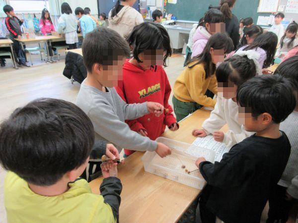 休み時間には、校庭の芝生でバッタなどの虫を探す姿が見られます。昆虫が好きな子どもたちの中では、虫捕りがちょっとしたブームのようです。