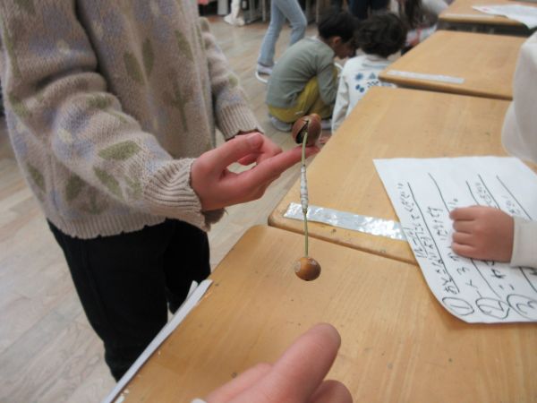 今日は1年生がお店屋さんを開きます。生活科の秋探しで観察したどんぐりやまつぼっくりなどを使って、おもちゃを手作りしました。1年生のアイデアがたくさん詰まったおもちゃで、2年生が笑顔で楽しそうに遊んでいます。ルールを説明したり、看板を手に呼び込みをしたりと、以前に2年生が招待してくれた「おもちゃランド」で体験したことを随所に生かす1年生でした。