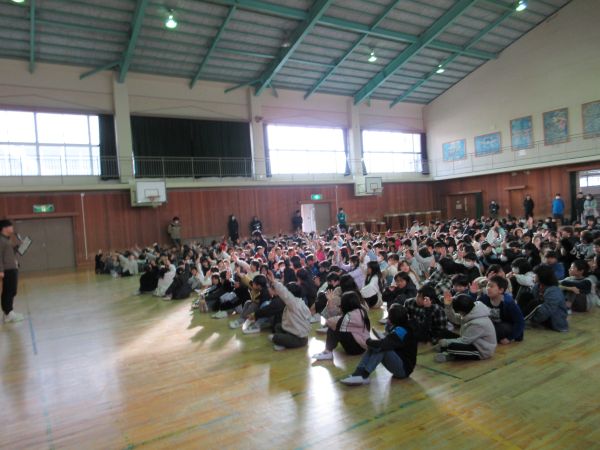 写真は、終業式の生活指導担当教員の話の中で、「明日からの冬休みが楽しみな人?」の問いに、ほとんどの児童が手を挙げた瞬間です。一気に体育館が沸きましたね。二島小学校の皆さん、安全で楽しい冬休みを過ごしてください!