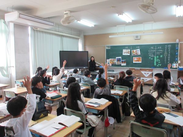 英語で歌を歌ったり、アルファベットを書いたり、英語でいろいろな友だちとコミュニケーションをとったりと、盛りだくさんの活動で、あっという間の楽しい1時間でした。端末も効果的に活用し、外国語でやりとりする面白さを体感する子どもたちでした。