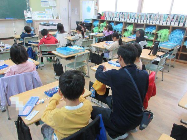 大きさ比べの学習ですが、前回の「長さ」に続いて、今日は「かさ」です。形が違うペットボトルいっぱいに入った水。どちらの方が多いか、方法を自分たちで考え比較します。楽しい活動に子どもたちの目はキラキラ。グループのお友だちと協力して課題を解決する姿は、1年生の成長を感じました。