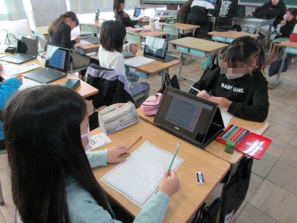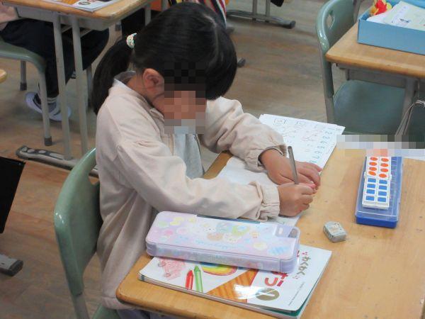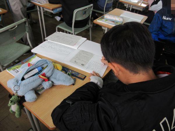 思ったことや考えたことを、グループやクラス全体で積極的に発言する活発な授業。授業最後の振り返りでは、教材文の登場人物に優しく教える文を黙々と書き綴る姿が印象的でした。