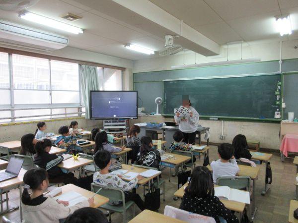 総合的な学習の時間で、門真市の魅力にについて探究的な学びを進めている3年生。今日は、校区にお住まいの方をゲストティーチャーにお迎えしての特別授業。昔から現在の門真市の様子を二島小校区を中心に、貴重な写真や資料とともにお話をしてもらいました。