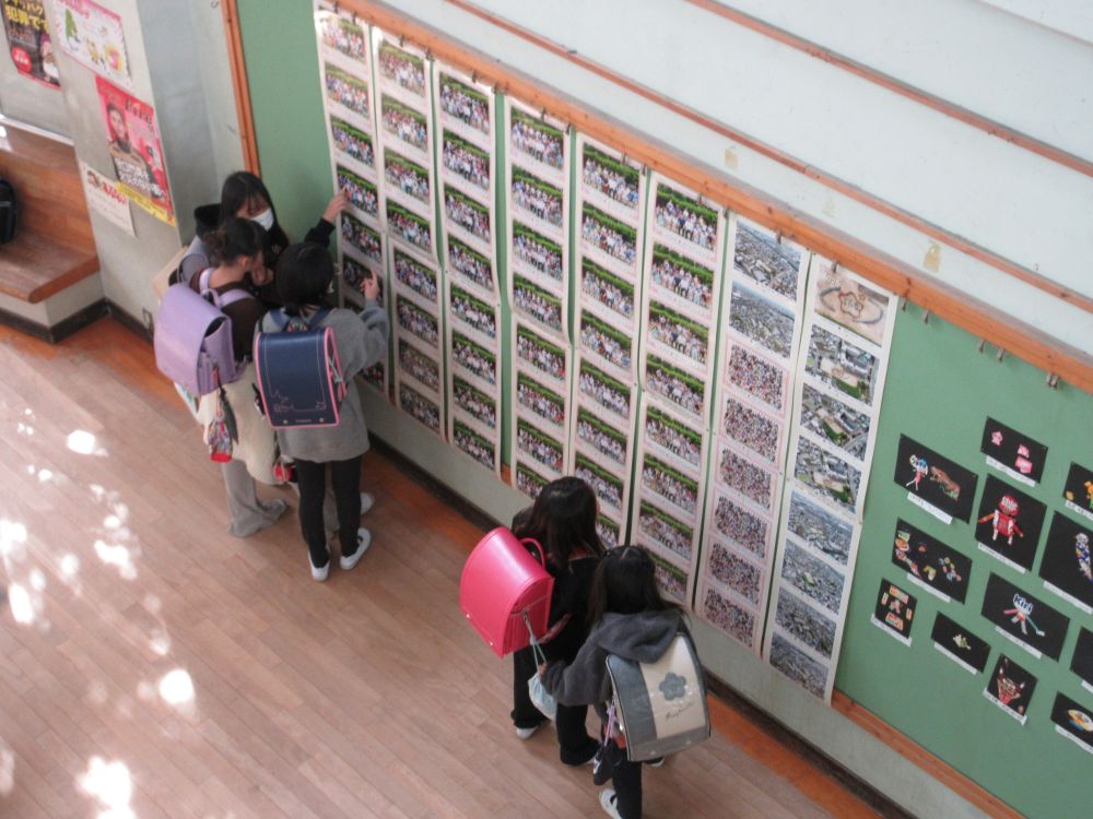 創立150周年記念事業の一つとして撮影した航空写真と集合写真を、一昨日から1階ホールに掲示しています。休み時間や放課後には、写真を熱心に眺める子どもたちの姿が見られます。
