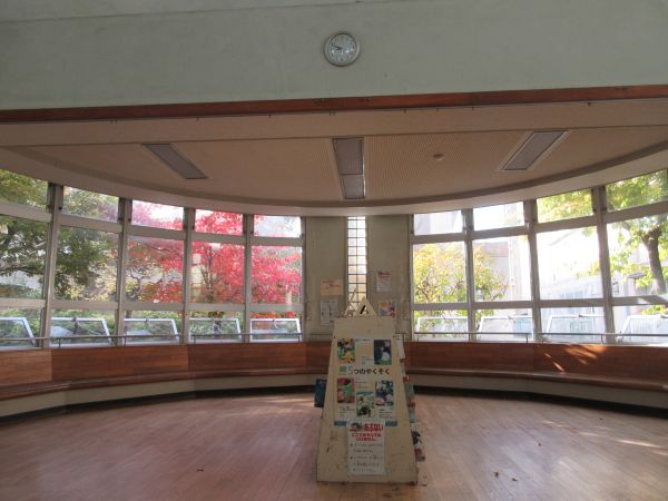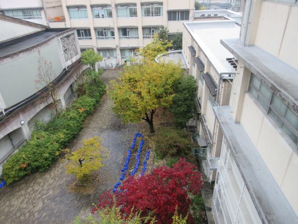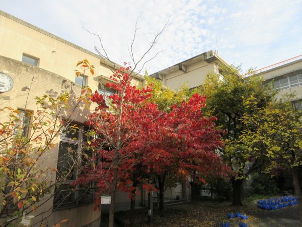 そして下の写真は、本校中庭と1階ホールで撮影したものです。空の青さに映える赤や黄色の葉っぱ。秋の美しさに思わず足を止め、見とれてしまいました。