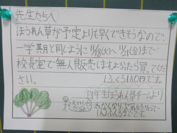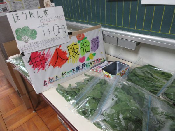 総合的な学習の時間に、野菜作りに取り組んでいる4年生。2学期は5種類の野菜をチームに分けて育てています。その中で、一足早く収穫できたほうれん草チームが、校長室で先生方に向けた無人販売を始めました。もちろん、事前に校長室に相談に来て、許可を得ての販売です。周知の手紙、看板、値段設定、袋詰めなど、すべて自分たちで行います。1学期の経験が生かされ、とてもスムーズに無人販売が進んでいました。