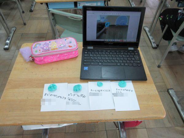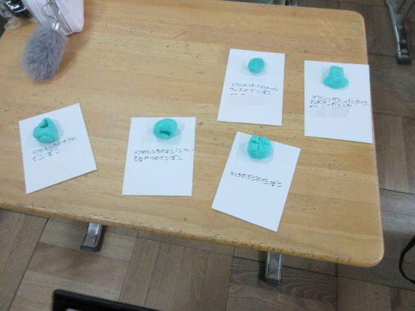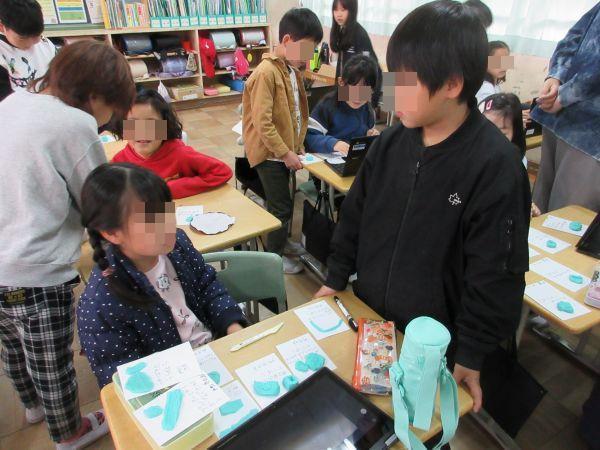 2年生の図画工作の授業です。身近にあるデコボコを粘土で型どったものを、お客さんになってくれたクラスのお友だに紹介しています。