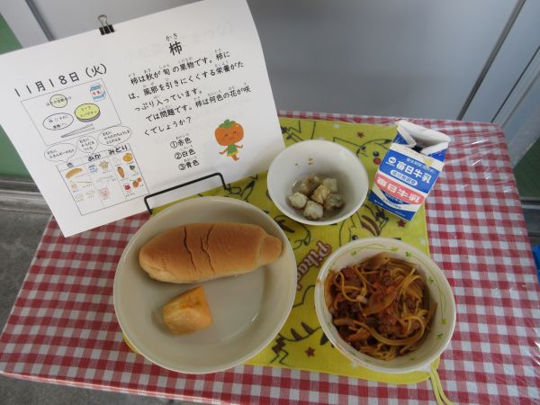 11月半ばを迎え、秋の深まりを感じます。給食では秋の味覚の「柿」が提供されました。丁寧に皮をむき、食べやすい大きさにしてくれています。
