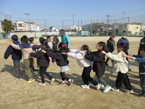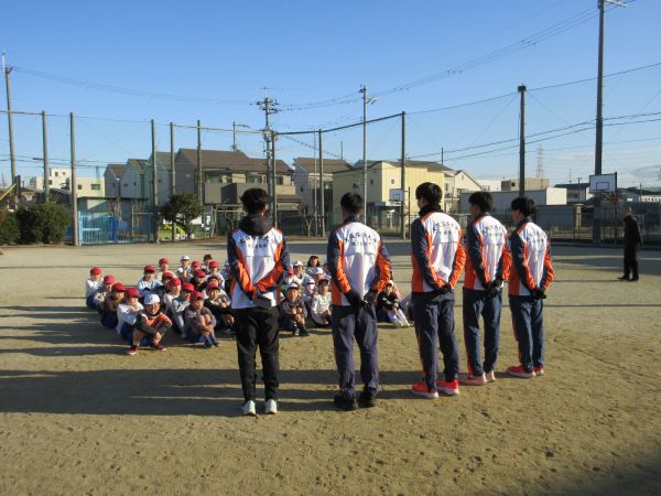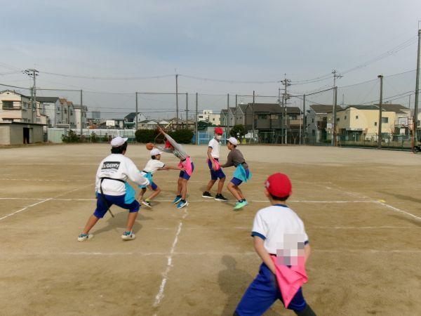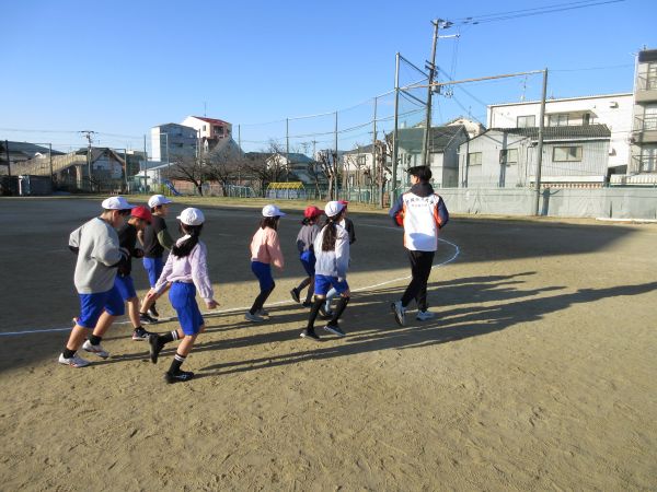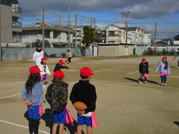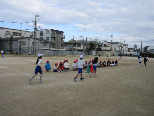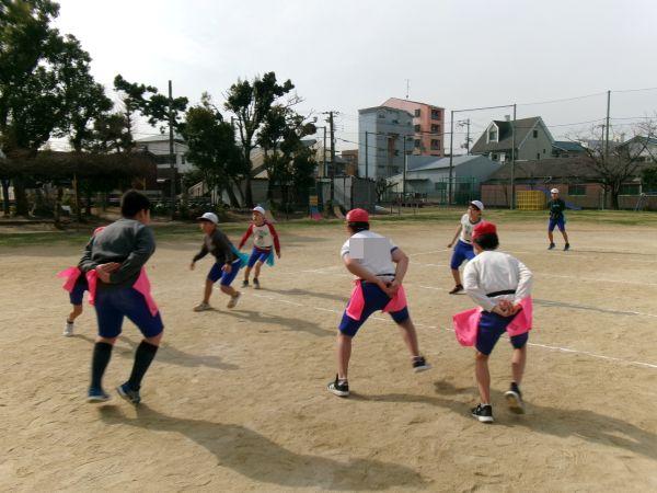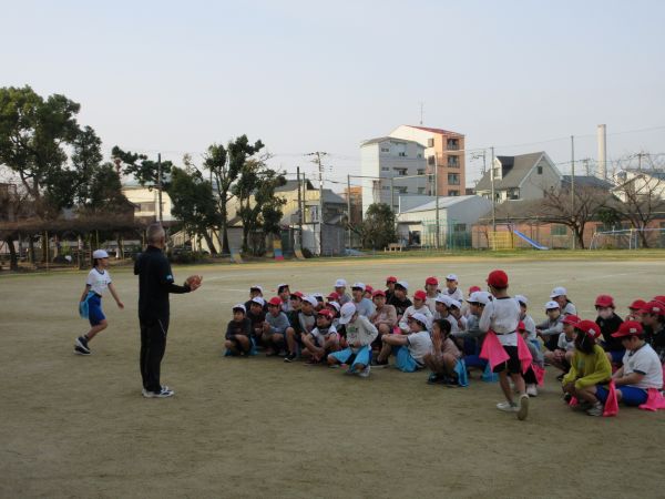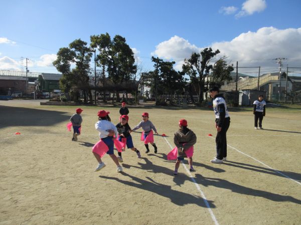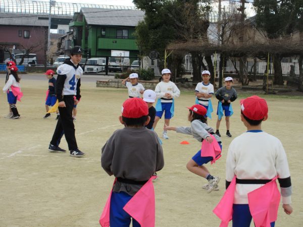 大寒の中でしたが、元気に動き回る子どもたち。発達段階に応じた工夫で、フラッグフットボールを通して、お友だちと一緒に体を動かす楽しさを存分に味わえた授業でした。