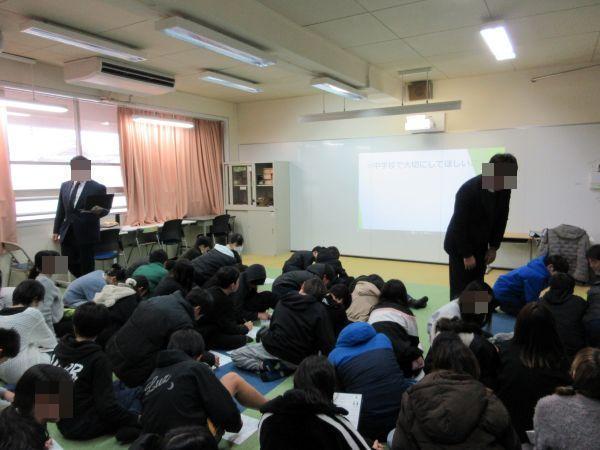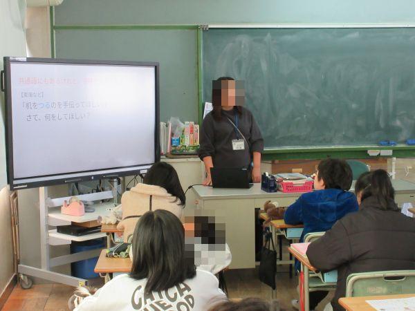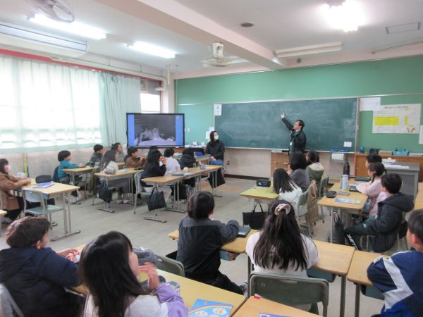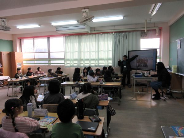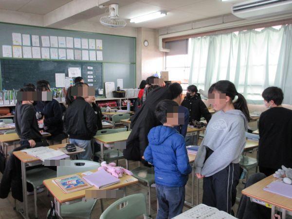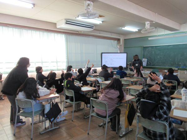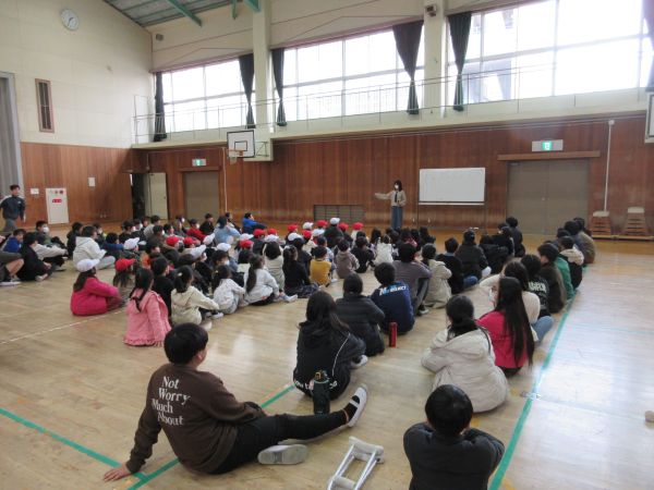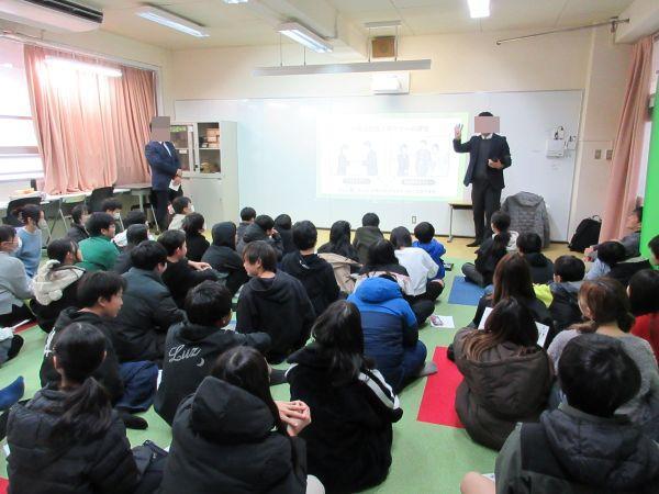 第七中学校の先生二人が来て、卒業をひと月後に控えた6年生に、中学校生活についてお話をしてくれました。学校生活の一日の流れや教科、テスト、授業、クラブ、校則のことなど、丁寧に詳しく教えてくれました。中学校には20分休憩がないという事実を知った子どもたちは「え~?!」と、この時間一番の大きな声で反応していました。