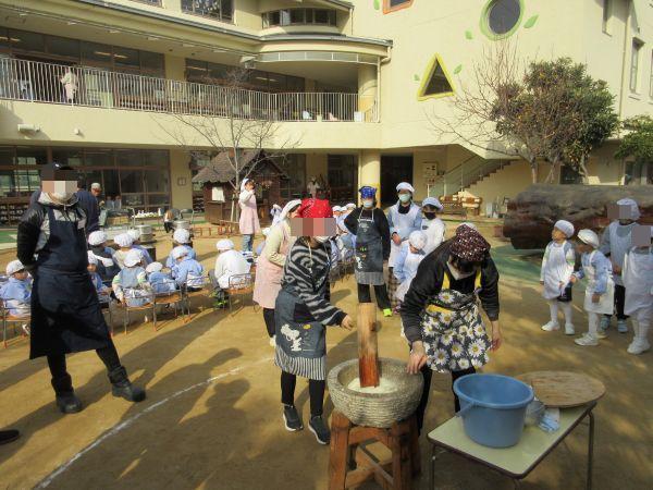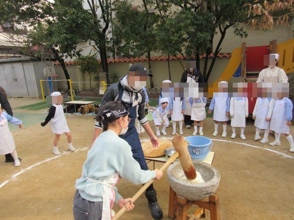 幼稚園に到着した時は硬い表情の5年生の子どもたちでしたが、出迎えてくれた園児の屈託ない笑顔と明るさに、緊張が和らいでいくのがよくわかりました。こま回し、紙飛行機、すごろく、書初め、ふくわらい、カルタ、カードめくり、絵合わせなど、幼稚園のクラスごとに様々な活動を一緒に楽しみました。また、今日は大阪ひがし幼稚園の餅つき大会でしたが、餅つきにも参加させてもらい、全員が杵を手にしました。「苦しくない?」とエプロンの紐を結んであげたり、「一緒に行こう!」と手を引いてあげたりと、とにかく優しい優しい5年生でした。
