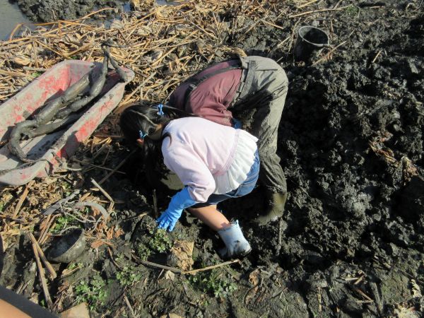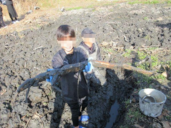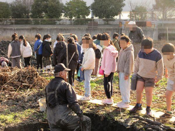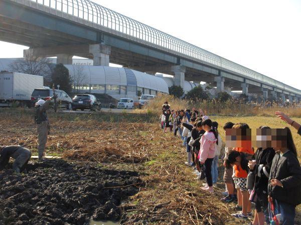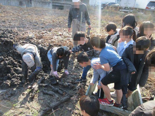 社会科と総合的な学習の時間で、門真市の名産である「門真レンコン」について学習している3年生。今日は地域の方からご紹介をいただき、その収穫の様子を見学させてもらいました。50~60センチメートルの深さに横に伸びる立派なレンコンを、傷つかないように丁寧に掘る作業。しかも、冷たい泥の中で足元も安定しない大変なお仕事です。そんな様子を間近で見ることができ、門真レンコンに対する愛着が一層増したことだと思います。給食で「門真レンコン」を使った献立が提供されるのが楽しみですね。