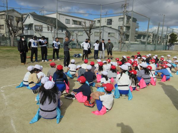 今回は4年生と6年生です。関西アメリカンフットボール協会の方のテンポよく分かりやすい指導で、子どもたちはすっかりフラッグフットボールに夢中。楽しく活動する子どもたちの声が、職員室にもよく聞こえてきました。