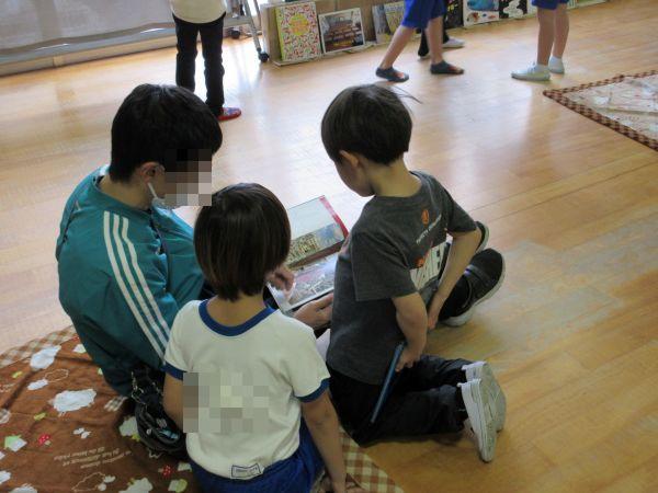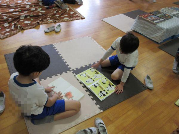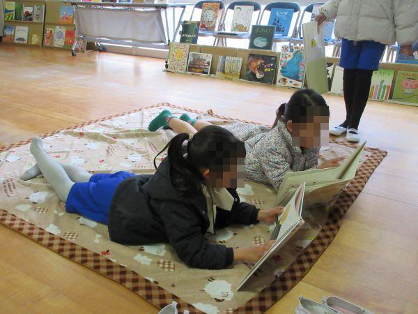 写真は1年生のクラスが絵本の広場を楽しむ様子です。お友だちと一緒に並んで読んだり、寝転がって読んだりと、なんとも微笑ましい風景です。