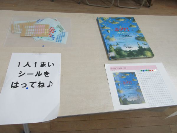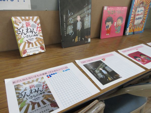 ホールに並べられた12冊の図書委員会おすすめの本。二島小学校のみんなに手に取ってもらい、好きな本のところにシールを貼ってもらいます。先週末から始まりましたが、すでにたくさんのシールを獲得してる本もありますよ。どの本が二島小学校で最も支持されるか楽しみですね。
