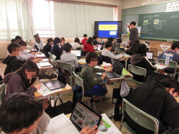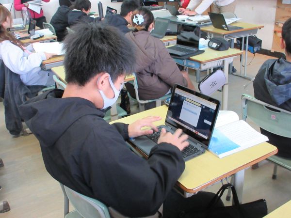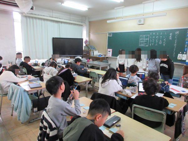 1組は国語。自分で入力したページを電子上で提出し、みんなで共有していました。