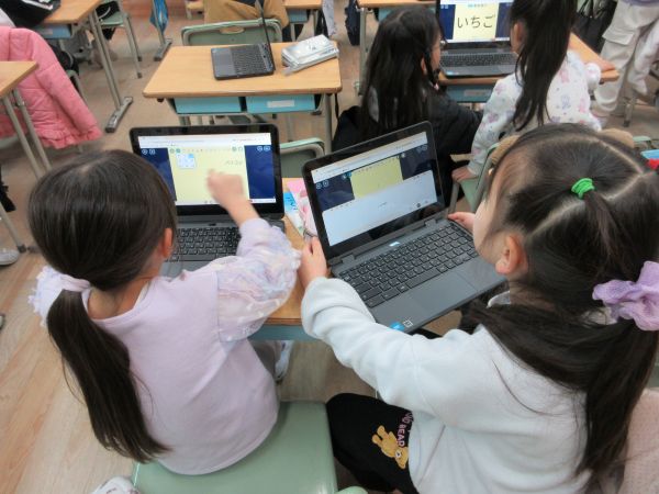 1時間目に1年生の教室をのぞくと両方のクラスとも、ノートや鉛筆を使うように、Chromebookを活用しながら勉強していました。