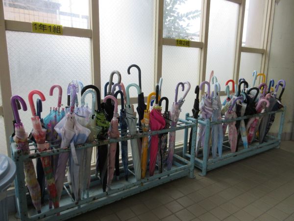 玄関では持ってきた傘を自分できれいにたたみ、決められた傘立てにおさめる1年生の姿がたくさんありました。上手にたためたよと、誇らしげに見せてくれる1年生も。