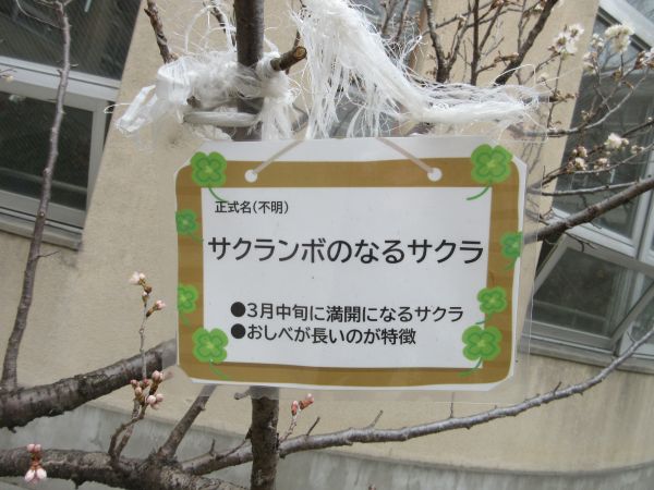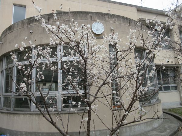 中庭にあるおしべが長いのが特徴の「サクランボがなるさくら」の木が2月下旬より咲き始めました。昨年度は3月の卒業式時に満開になったのを覚えているで、今年は早めの開花でしょうか?