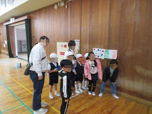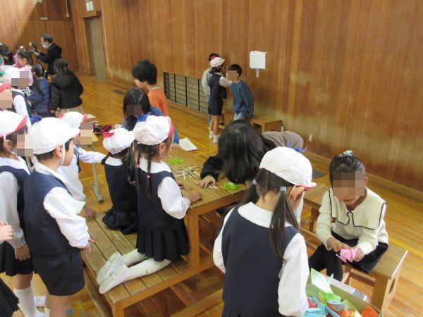 1年生代表の挨拶で始まった交流会。まず初めは、手を繋いで校舎の1階と2階を案内しました。そして体育館に戻った後は、1年生が生活科の学習で準備した手作りの遊びを楽しんでもらいました。10ブース以上ある工夫が凝らされた遊びを笑顔で楽しむ園児。そして、優しく丁寧なおもてなしの1年生。1時間の短い交流でしたが、和気あいあいの温かい空気が体育館いっぱいに広がっていました。