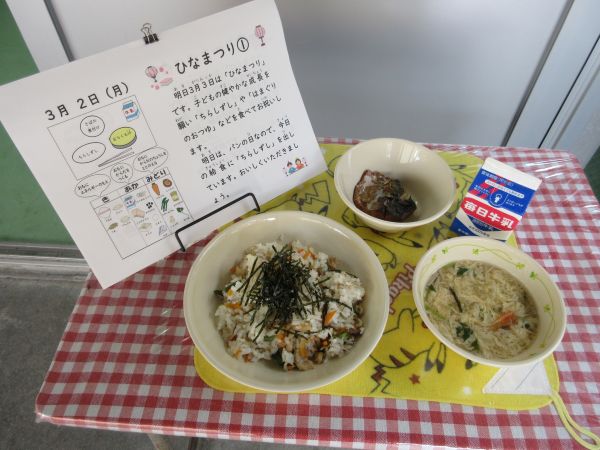 今日の給食は明日のひな祭りを控え、ちらしずしが提供されました。春ですね。