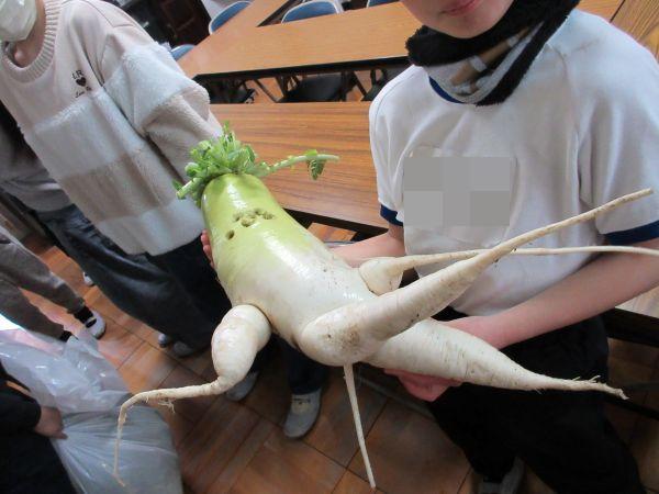興奮気味に部屋に入ってきた4年生。1年間野菜づくりに励んできましたが、最後の大根の収穫で、こんなビックサプライズが…。今にも動き出しそうな人の形をした大根が、土の中から出てきたそうです。