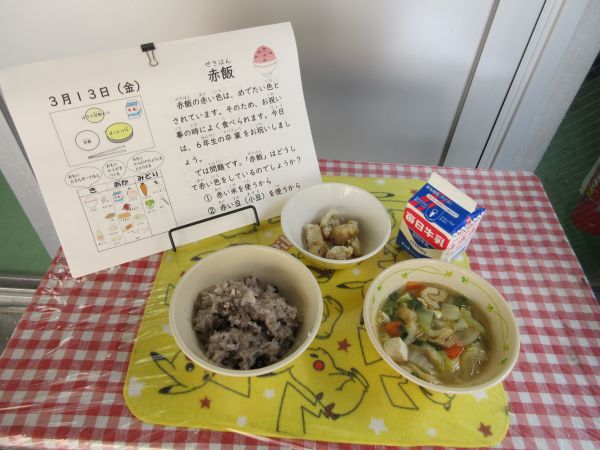 卒業式を来週に控えた6年生を祝って、今日の給食では赤飯が提供されました。いつもおかわりをいっぱいして、給食を楽しみにしていた6年生。調理員さんからも、毎回空で返却される6年生の食缶を見て嬉しくなりますという言葉をいただいています。
