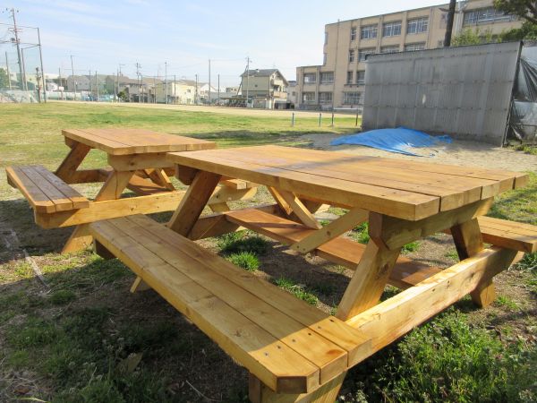 二島パーク近くの登り棒の前に2台の木製ベンチが設置されました。これは、第七中学校区地域学校協働本部から、校区の小学校に寄贈していただいたものです。休み時間に友だちとおしゃべりをしたり、屋外での活動で使用したりと、子どもたちが笑顔でベンチに座る姿が想像できそうですね。