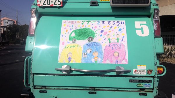 本校の2年生児童が描いた環境ポスターが選ばれ、市のごみ収集のパッカー車にプリントしていただきました。