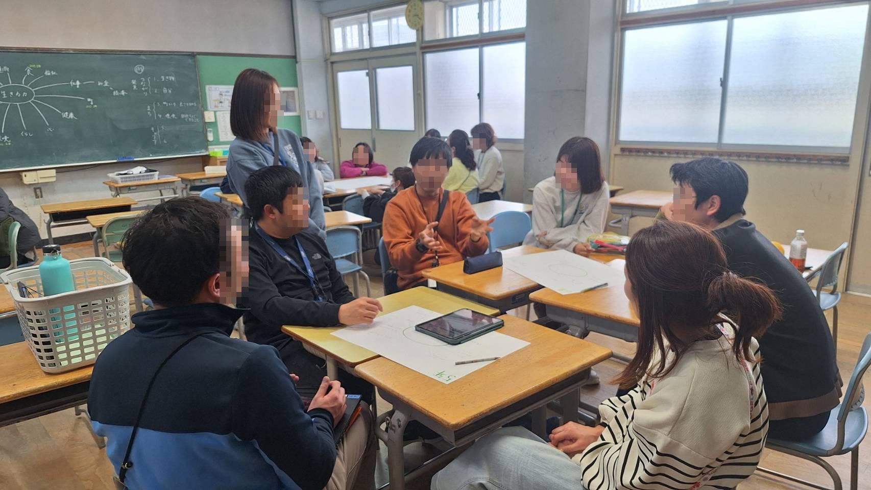まずは、探究学習をイメージするアイスブレイキングから始まりました。お題は、「被災した時に必要となるものは何だろう?」。作為的に分けられたグループで考え、その後交流しました。グループ分けも意味があり、それぞれのグループで考える観点が少し違っていて参考になりました。グループ分け、大事ですね。