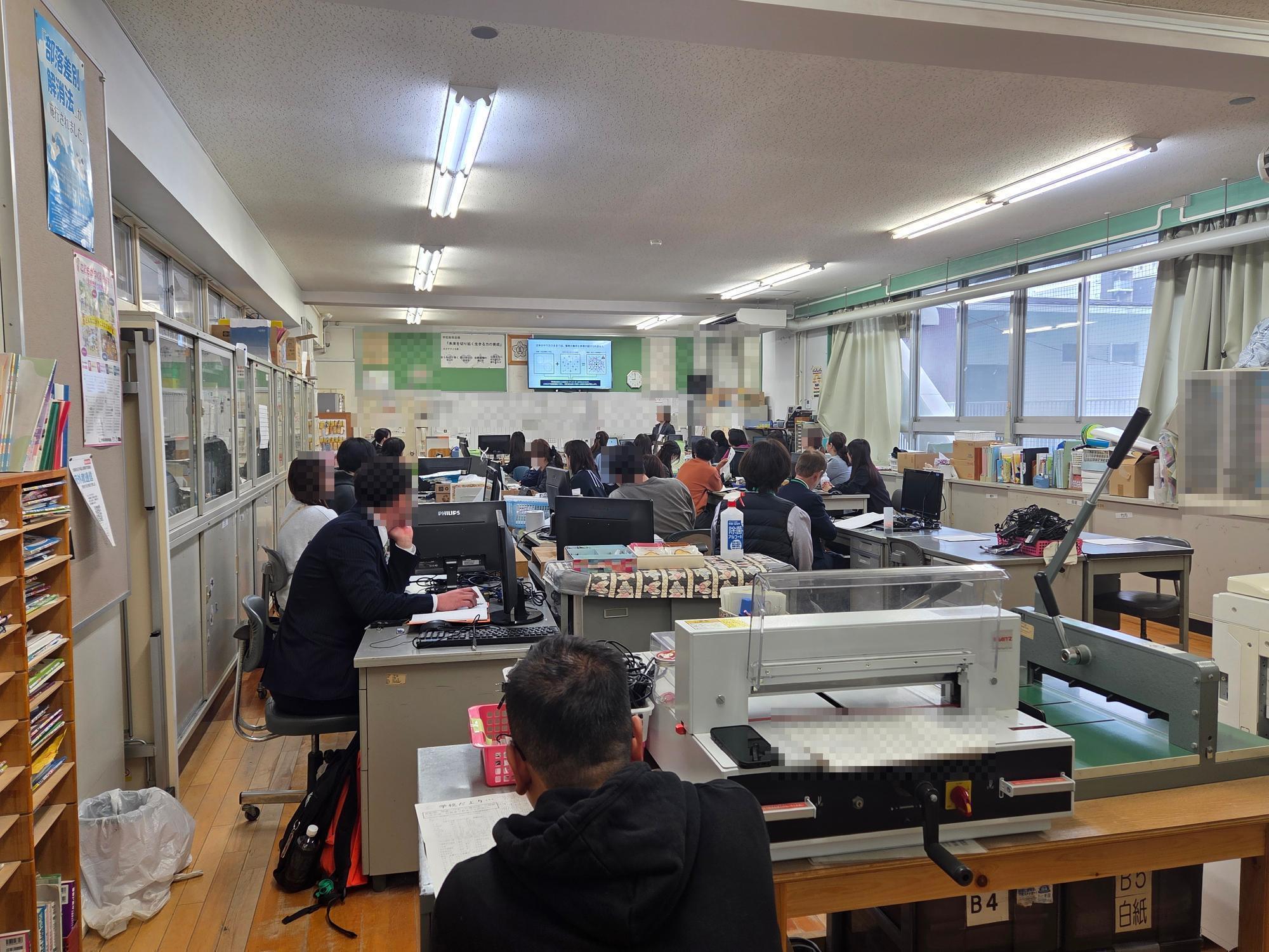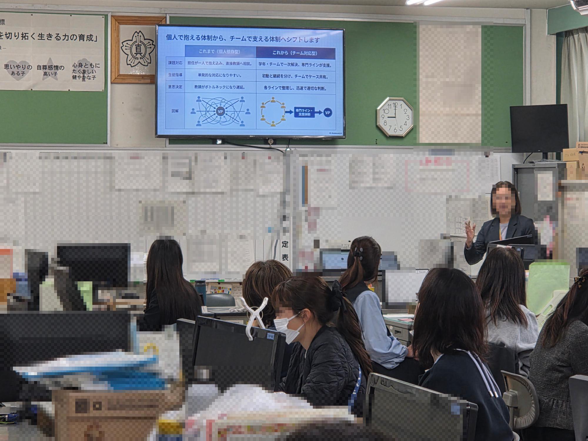 校長からの今年度の方針の概要説明の後、教頭から運用面(実務)について、全教職員へ説明がありました。