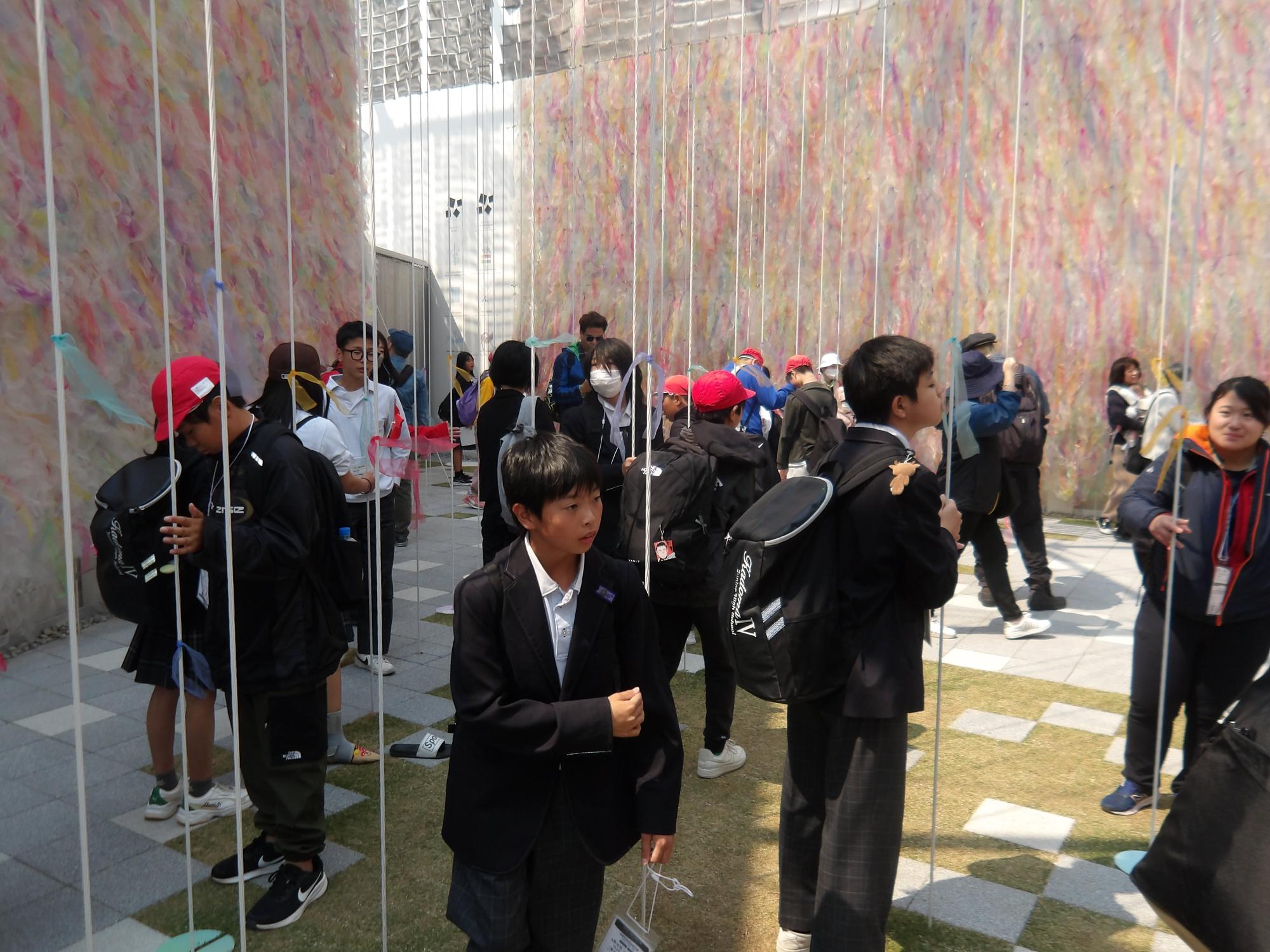 ほんと、四中生がすばらしい活躍でした。年下の子がいると優しいし、頼もしいですね。小学生のペースに合わせながら、事前学習したパビリオンなど会場内をまわり、一緒に楽しむ姿がありました。アメリカ館や中国館など有名なパビリオンに予約なしで入れた班、外国人のスタッフと気軽にコミュニケーションを楽しむ班、ブラジル館では顔にペインティングまでしてもらったりと、非日常の活気と熱気の中で、なにより子どもたちの表情がキラキラしていました。