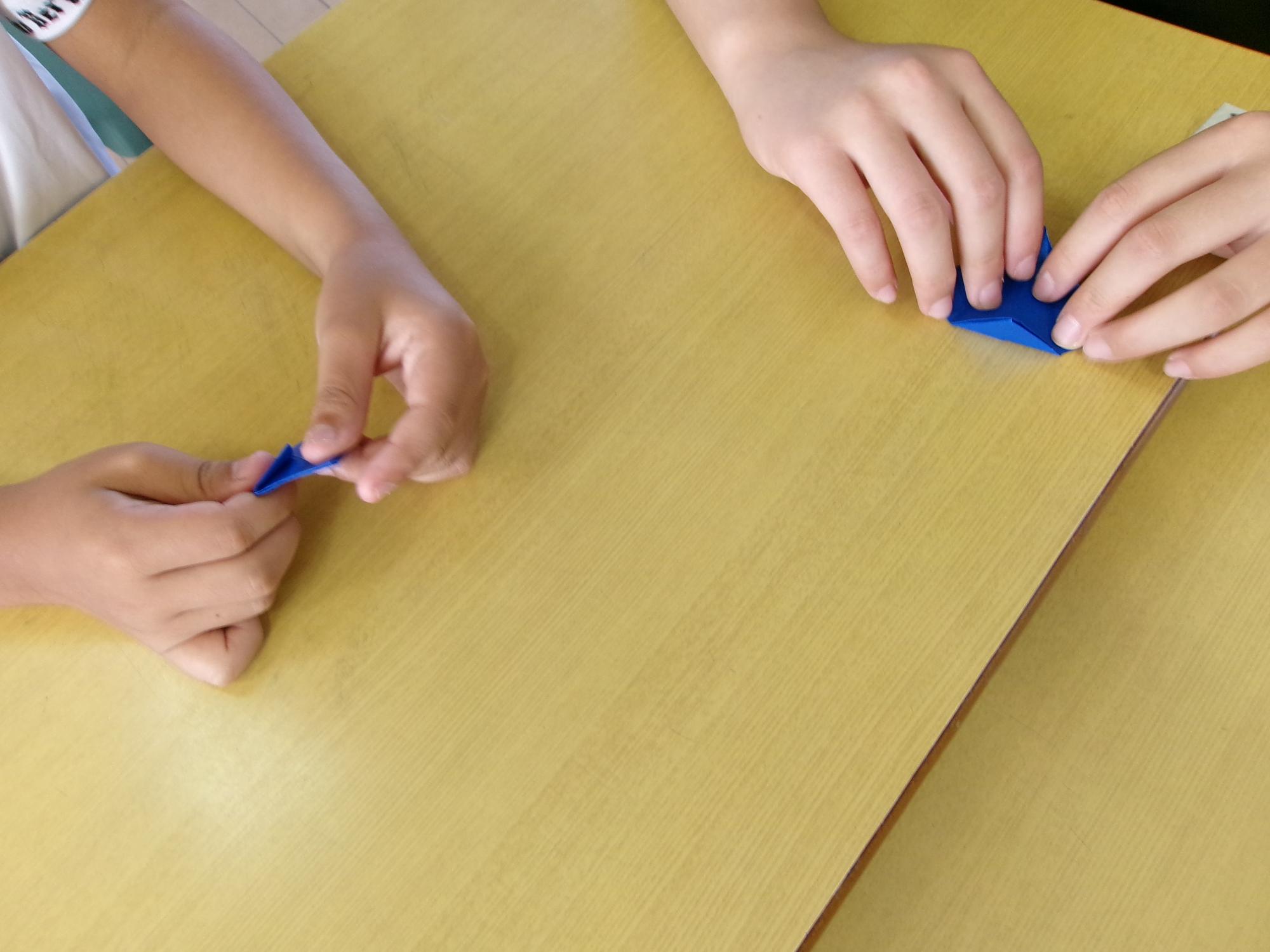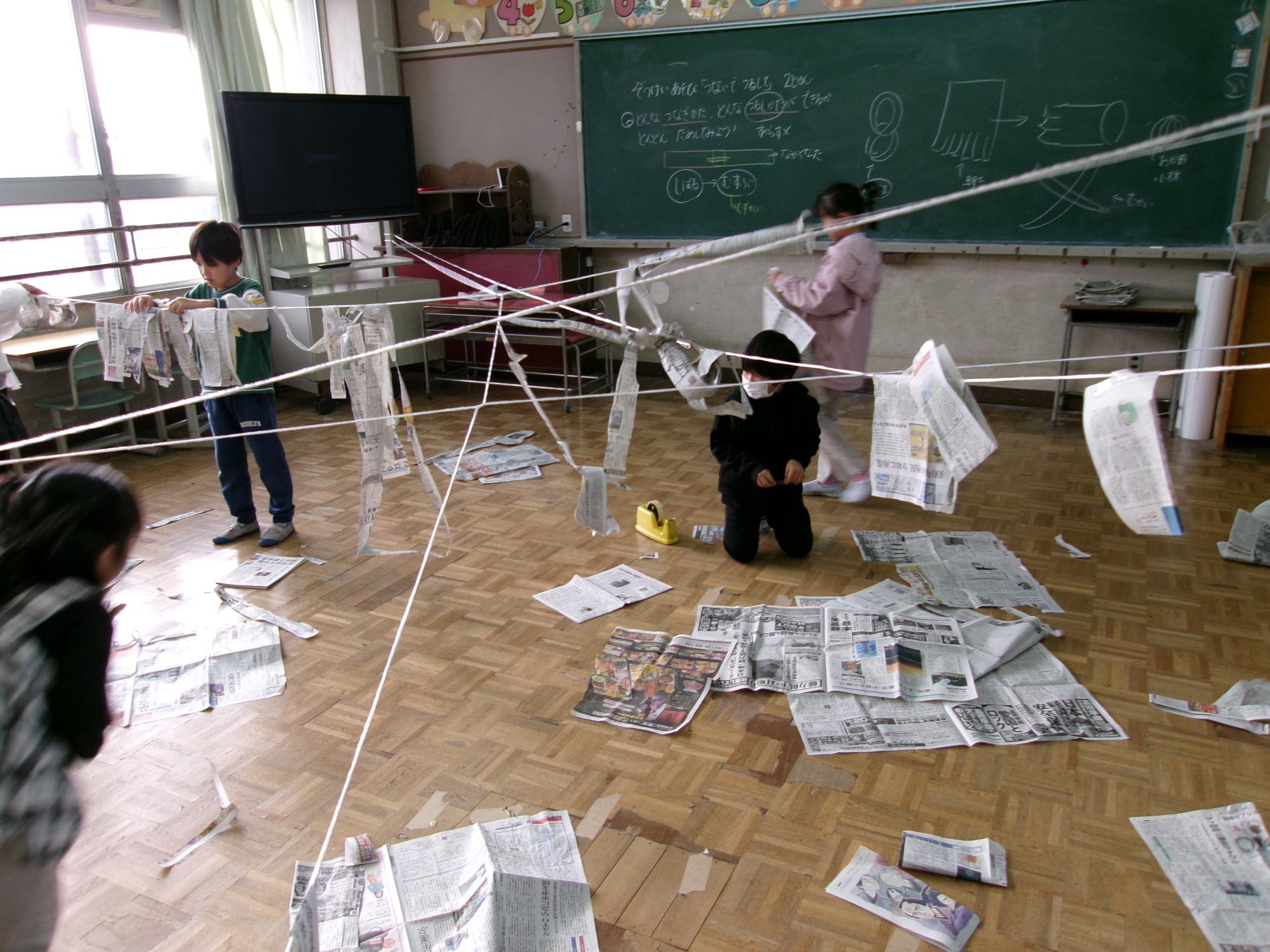 2年生「つないでつるして」ほそながいかみをつなぐとどんなことがおもいつくかな。
