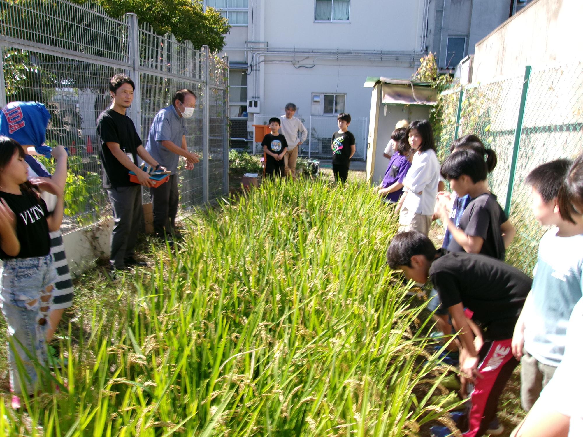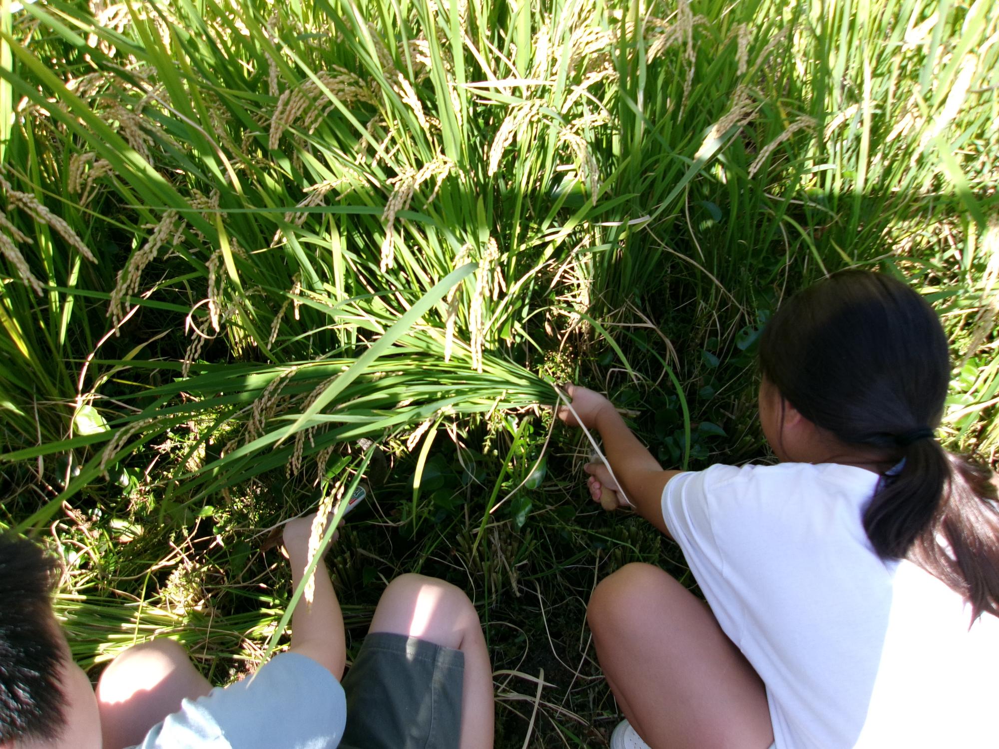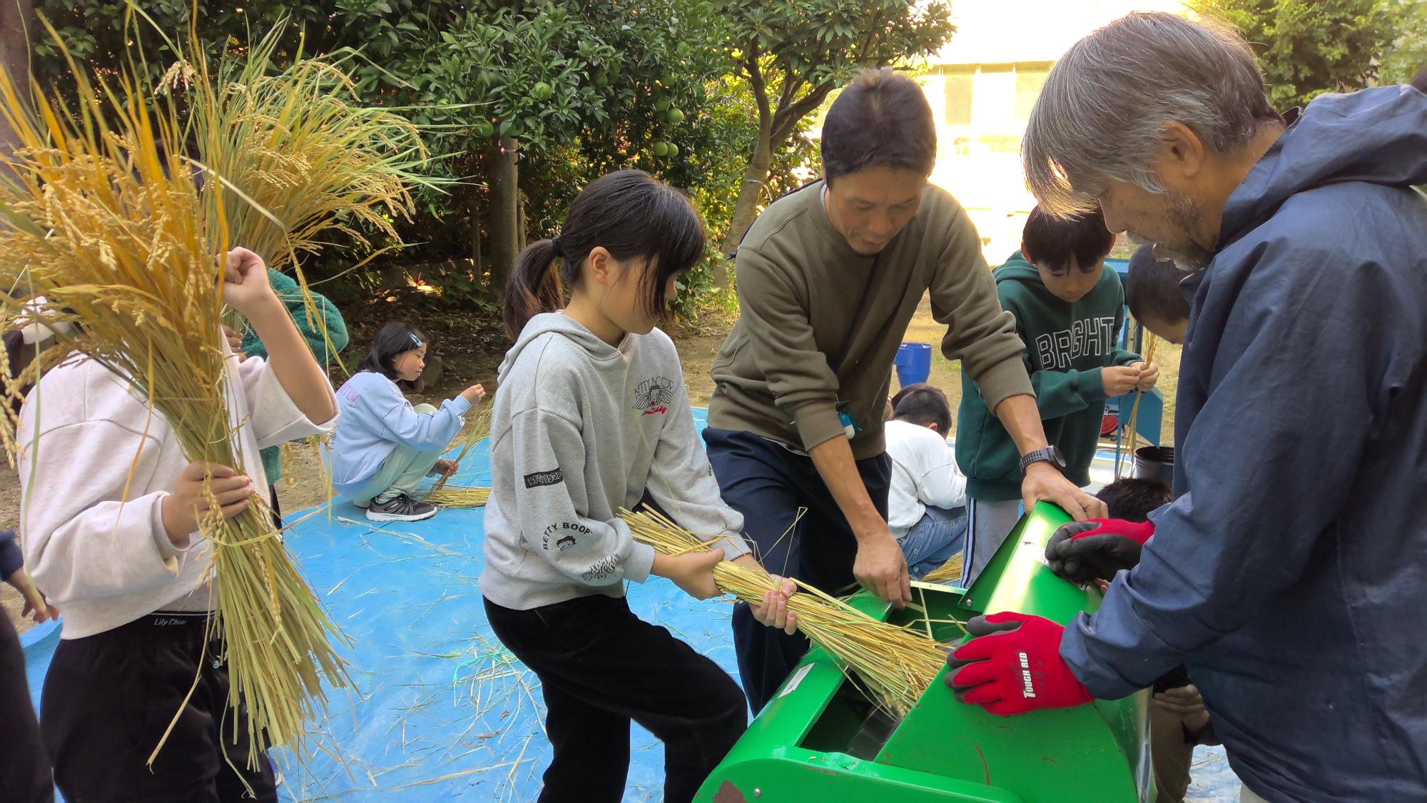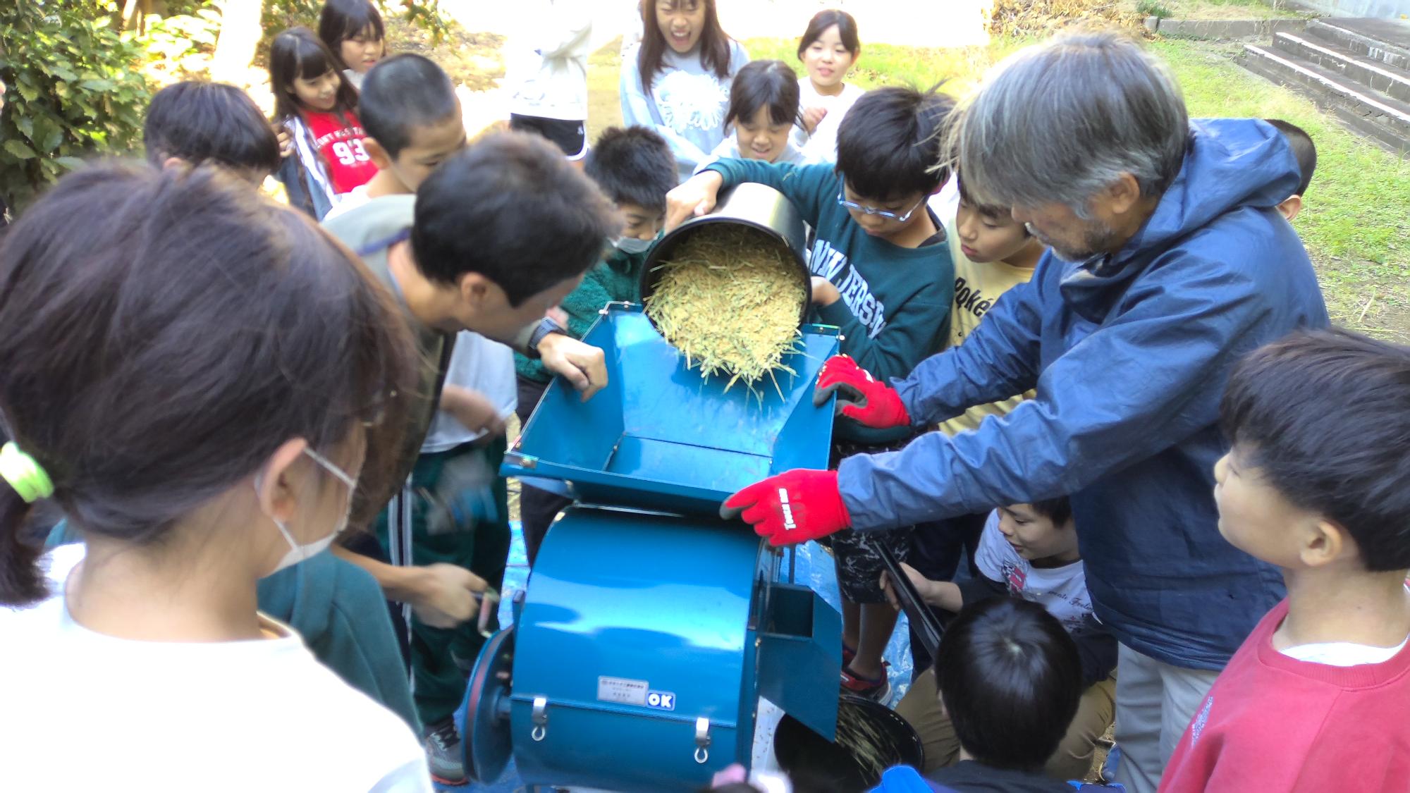 脱穀機に入れると、稲から籾が取れます。一人ずつ順番に作業をしました。