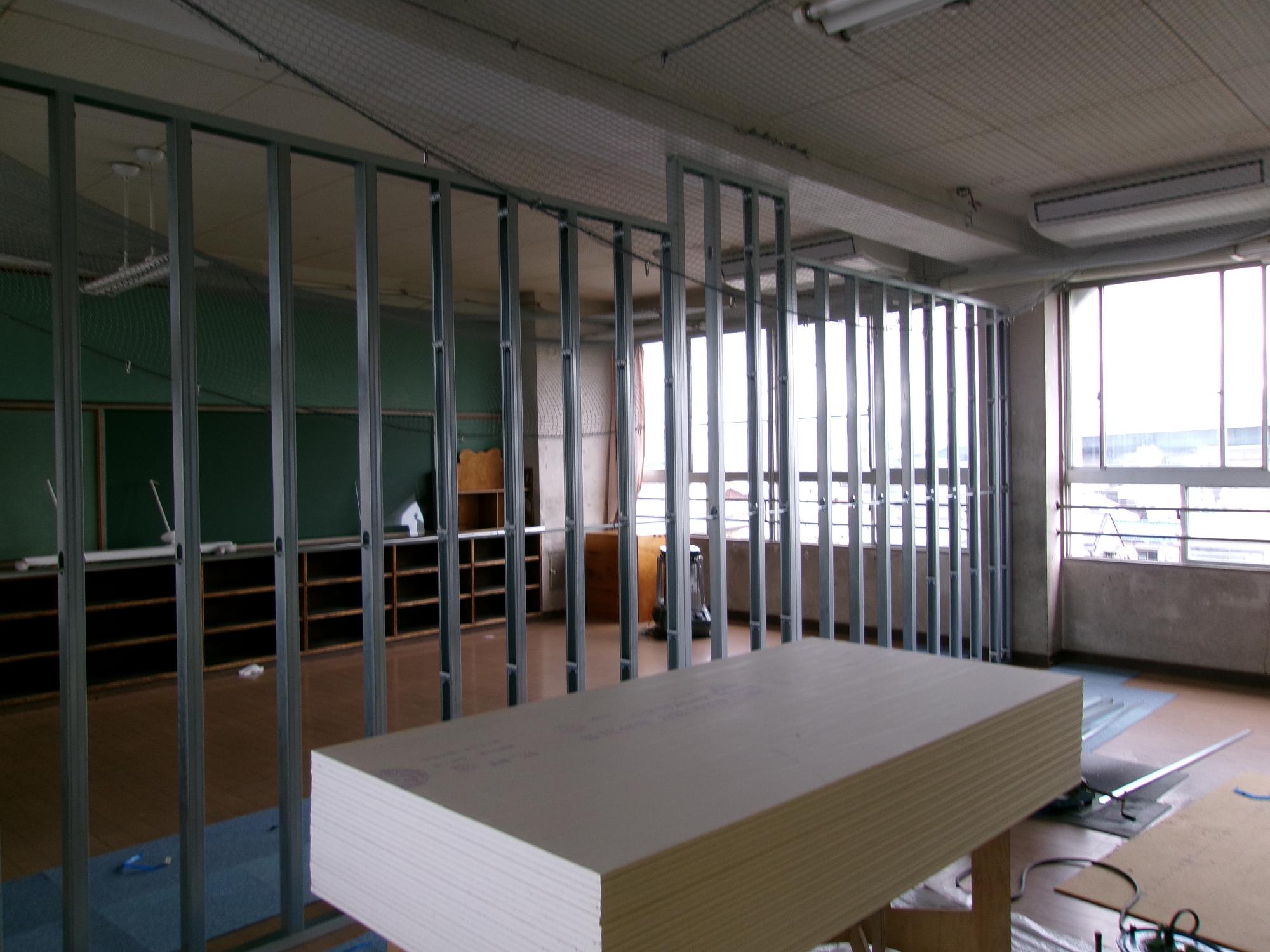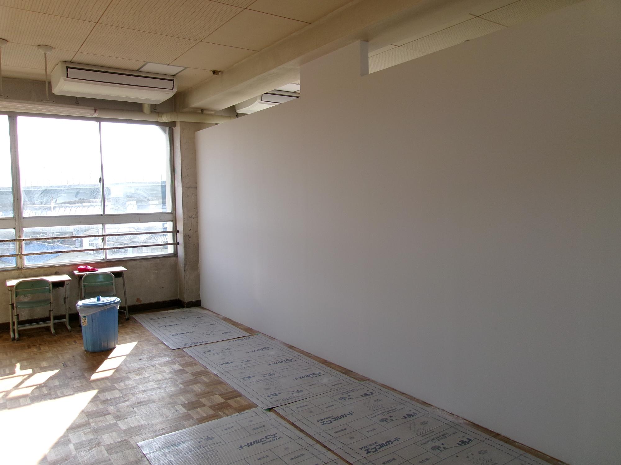 教室の真ん中に間仕切り壁を入れて2つの教室に。広さは普通教室の半分です。