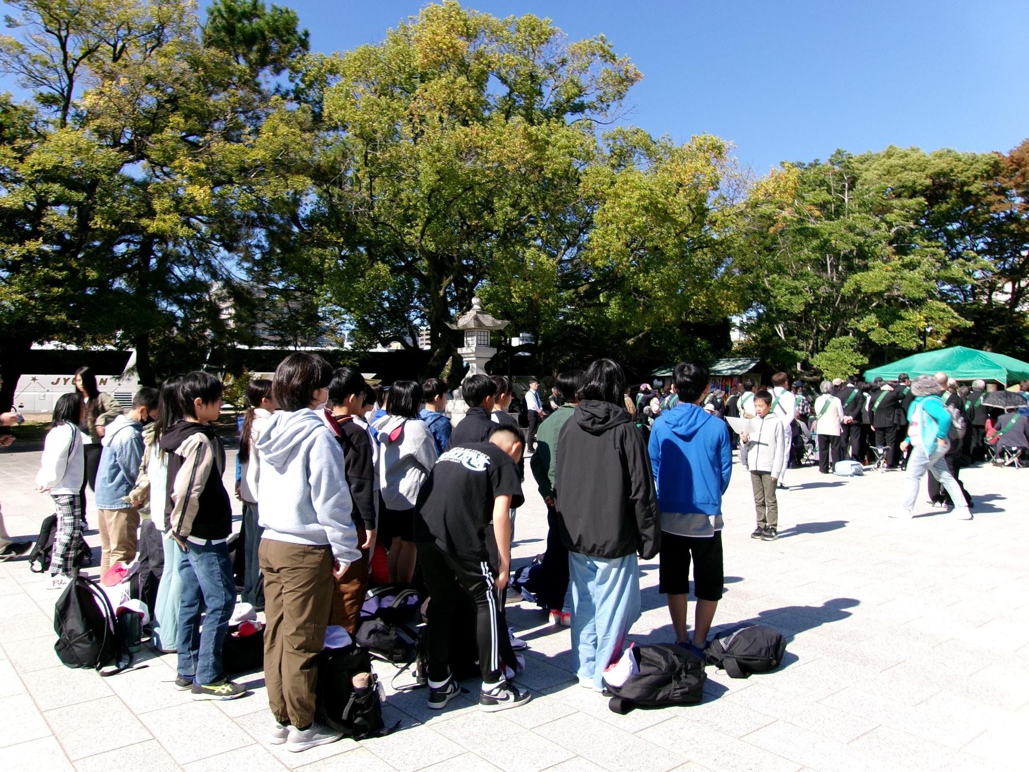 供養塔の前で黙祷