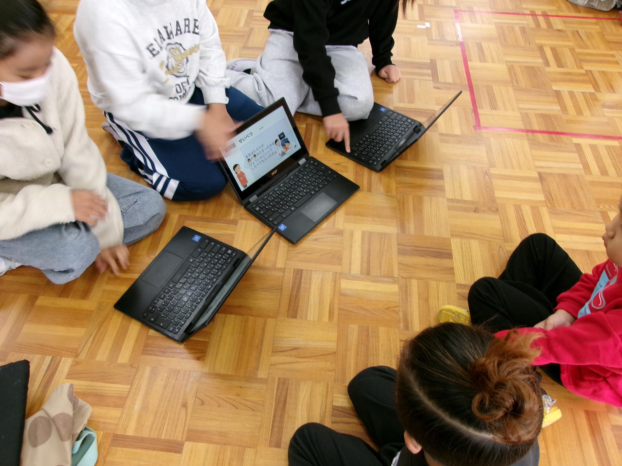 近くの保育園を訪問し、園児に聞いてもらいました。作ったスライドで説明したり、クイズ問題にして説明している児童もいました。
