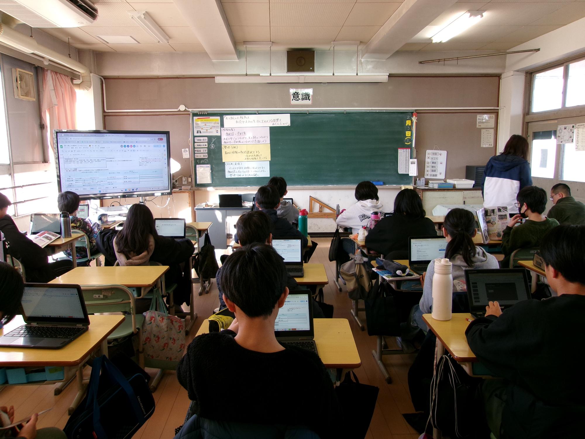 社会科の学びは、子ども達が学習課題に対し教科書を参考にして、ドキュメントやスライド、ロイロノートを使って整理してまとめています。