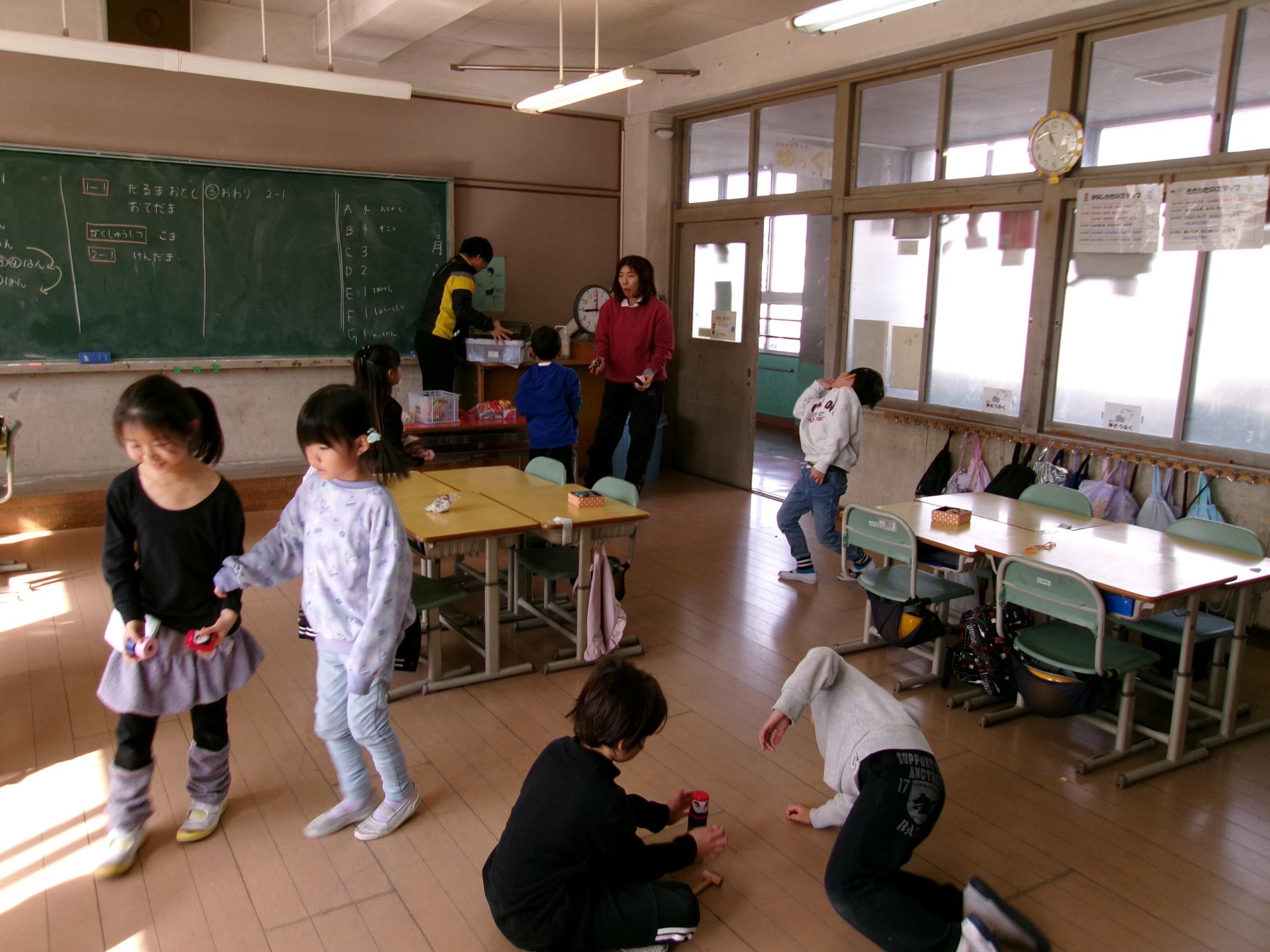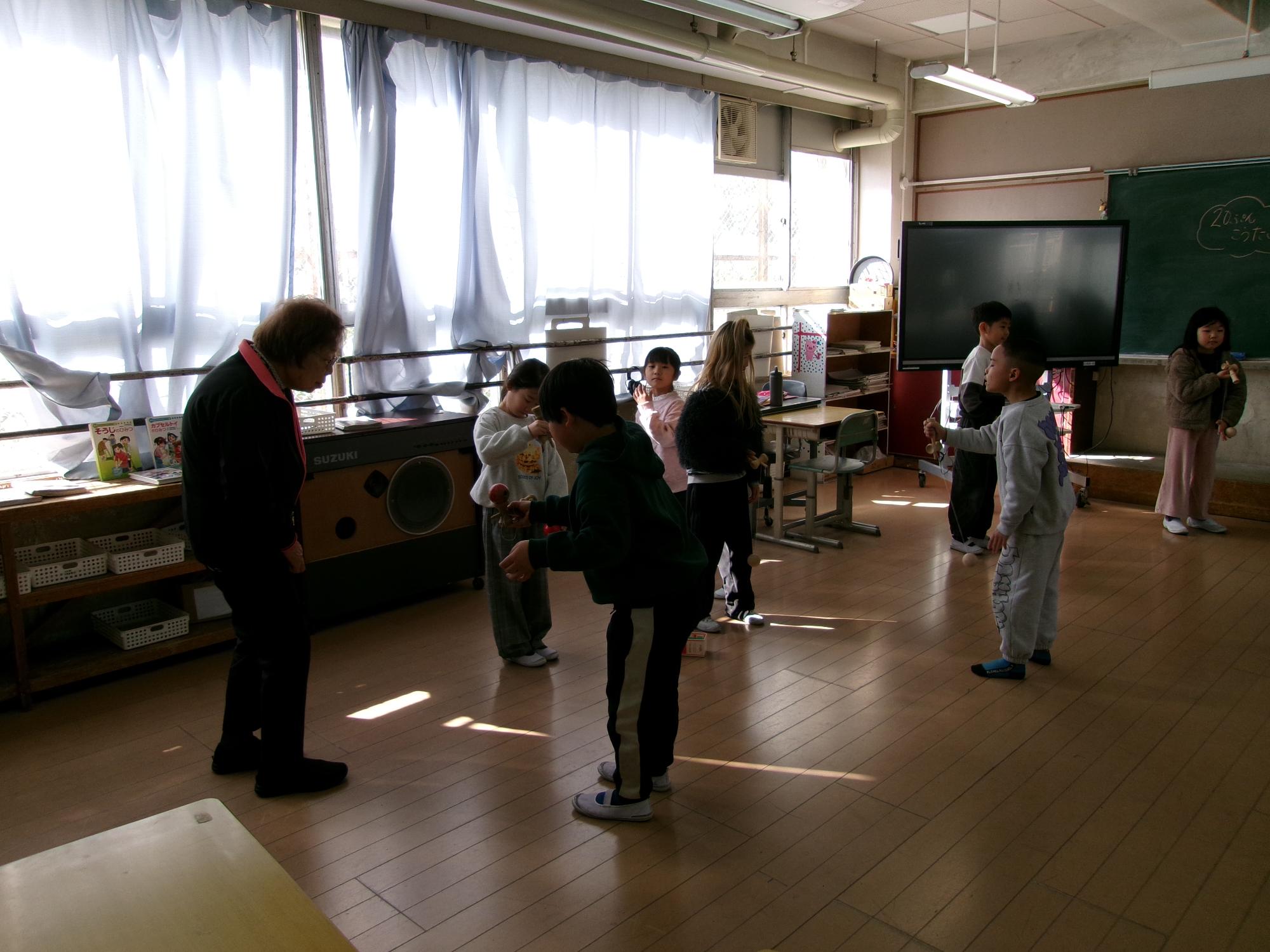 けんだま、こま、だるまおとし、おてだまなどをして楽しく活動できました。