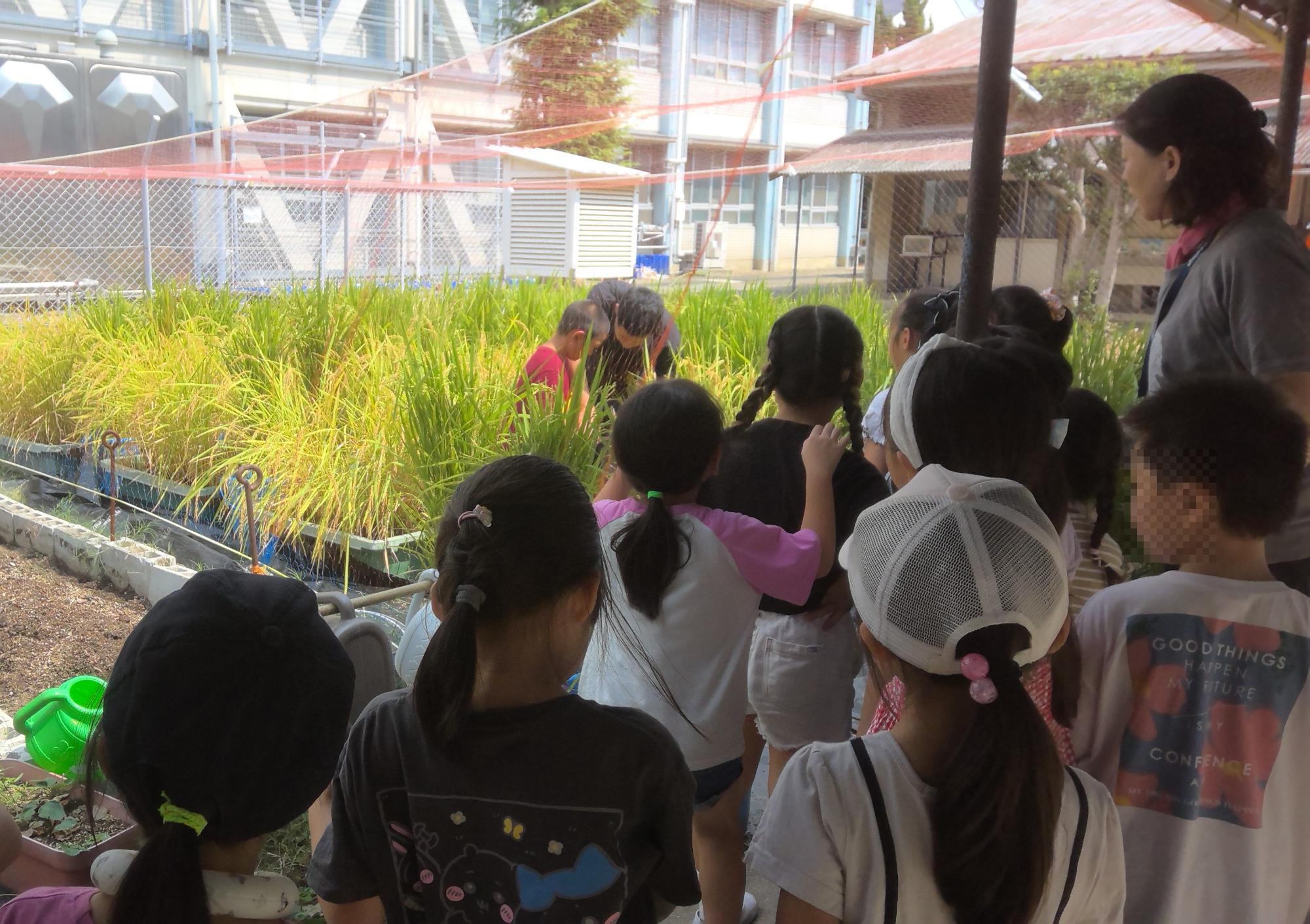 稲刈りの仕方を5年生の先生に教えてもらって、みんな嬉しそうでした。いよいよ秋の訪れです。