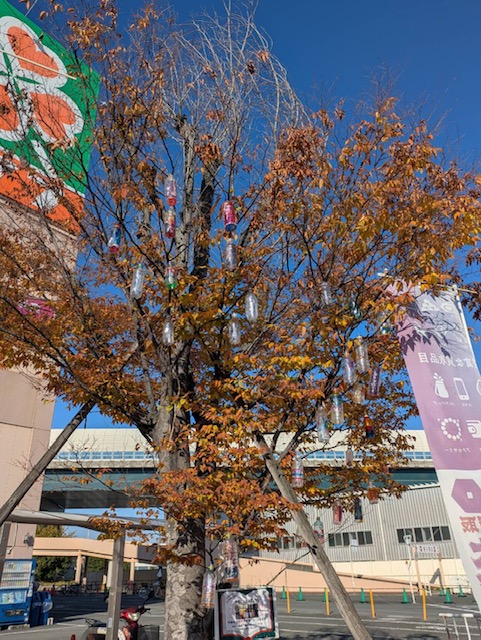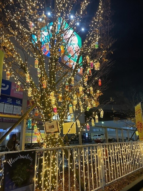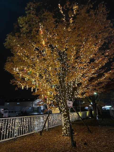 島頭三丁目にあるスーパー「ライフ門真店」さん。日頃より社会見学などで大変お世話になっている地元のスーパーです。その正面に樹木が植えられていますが、今年、その樹木が子どもたち手作りのランタンでライトアップされ、とてもきれいな灯りがともっています。