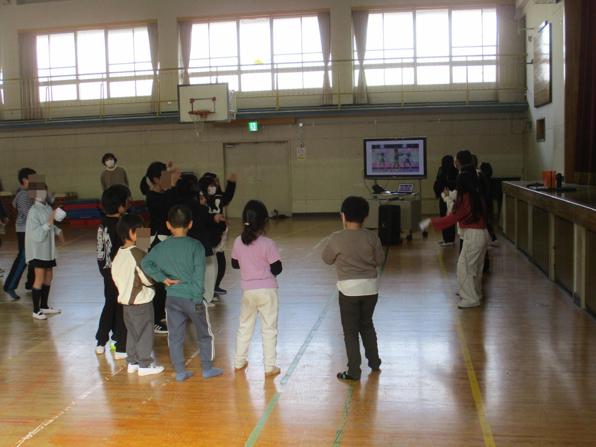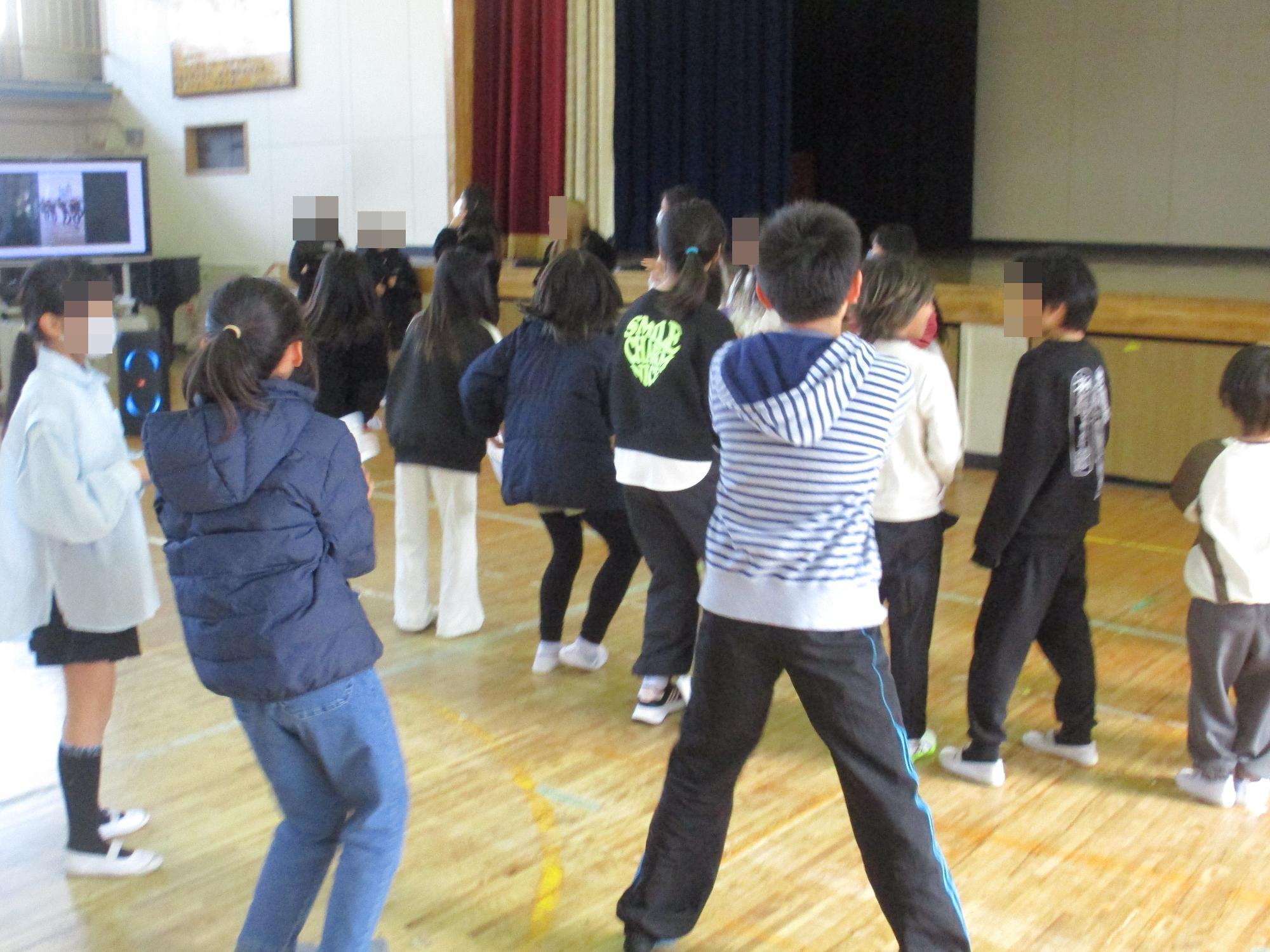 そのような中、保健委員会の子どもたちが中心となって「ハンカチフェス」を行っています。ハンカチの提示をチケット代わりとして参加できるダンスイベントを体育館で実施しています。昼休みなどに放送で周知すると、意外とたくさんの子どもたちが集まって、ハンカチを振り回しながらモニターに合わせて楽しそうにダンスをしています。