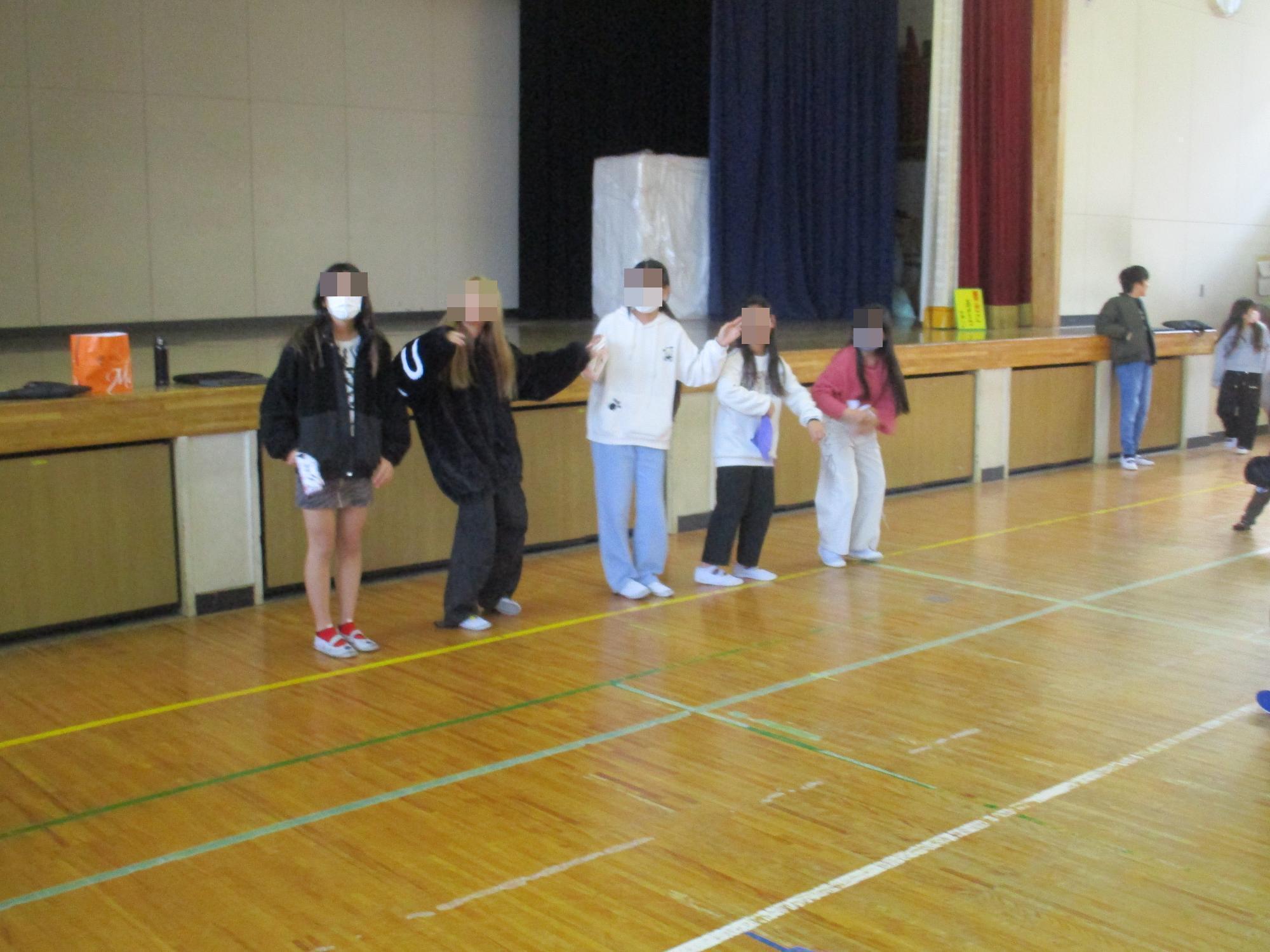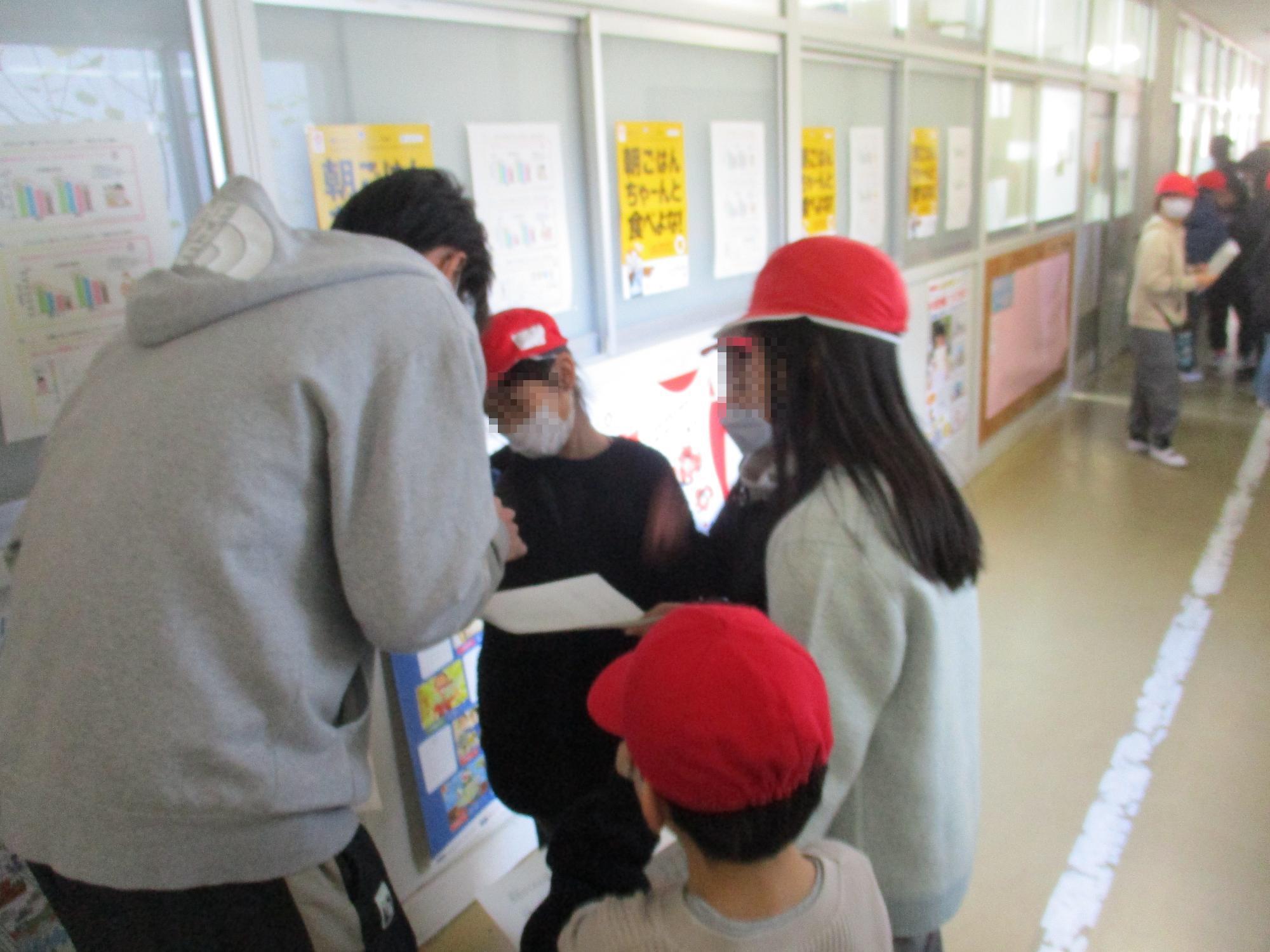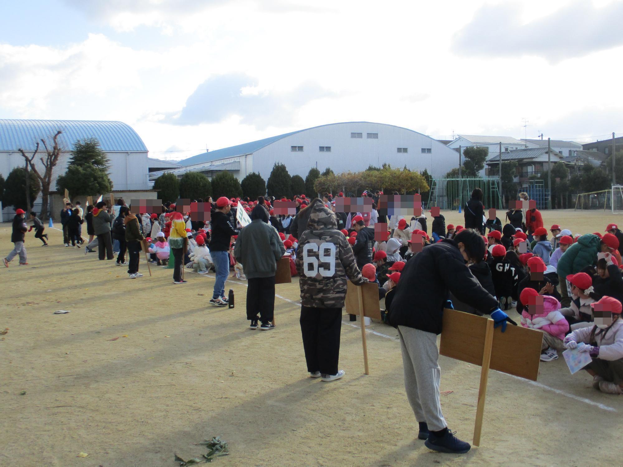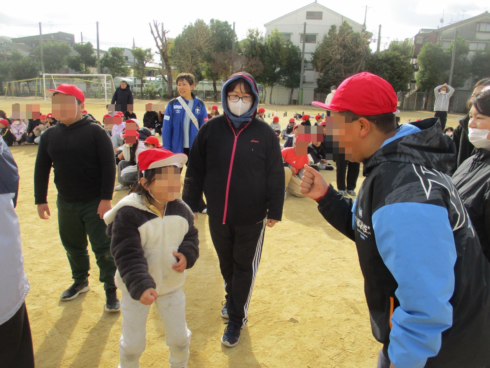 運動場では「追いかけ玉いれ」と「じゃんけん列車」を。校舎内では「先生探し」を行いました。寒い日でしたが、全員が運動場で走り回ったり、肩を組んで遊ぶ姿は熱気にあふれていました。校舎内でもたくさんの先生にスタンプを押してもらってうれしそうな子がたくさんいました。