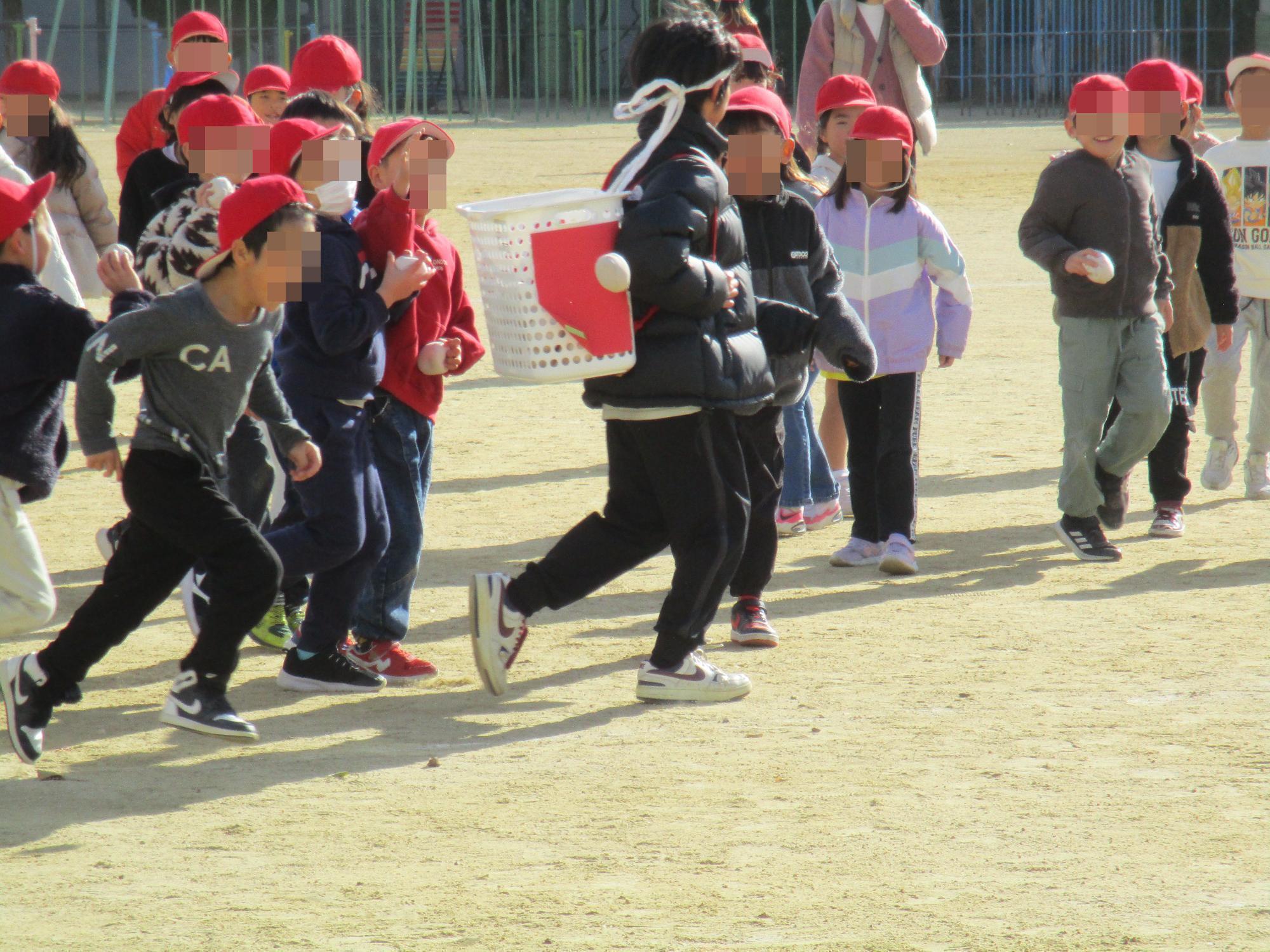 六年生の児童会委員がかごを背負って走り回ります。なかなか玉が入りません。